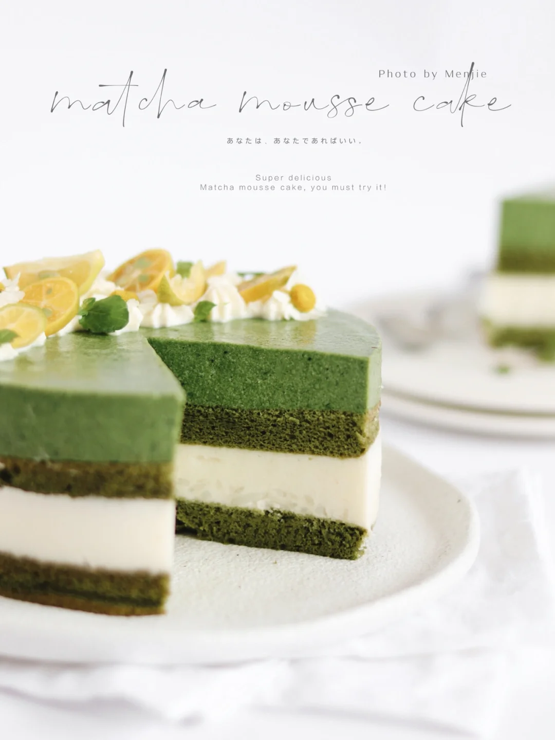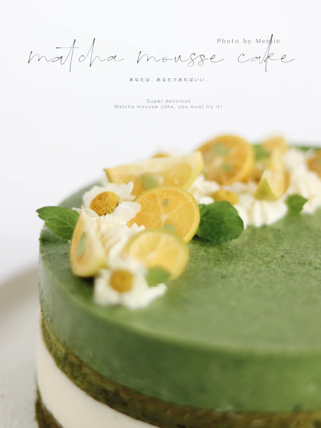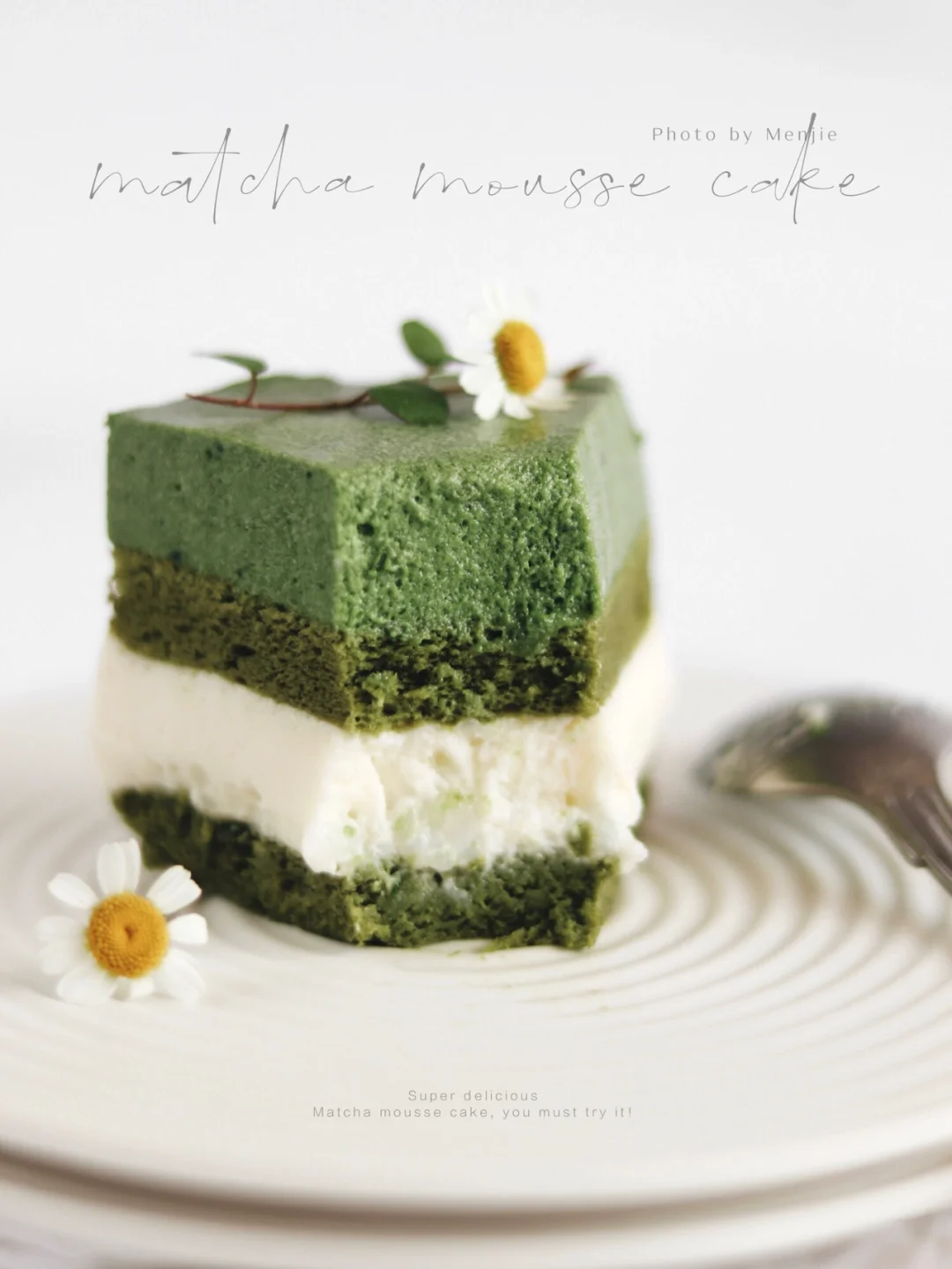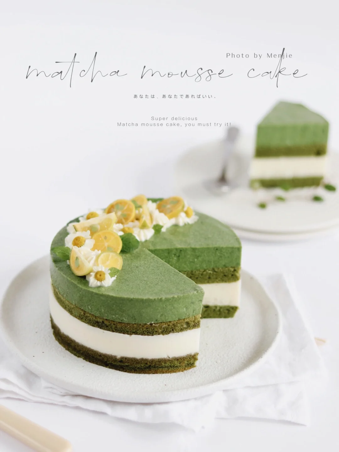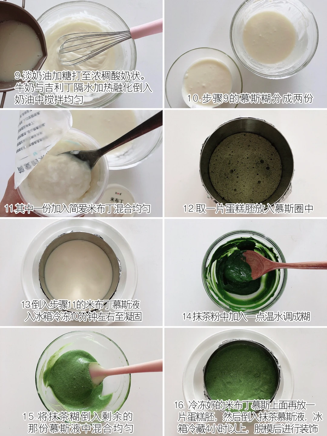 ❿冷冻好的米布丁慕斯上面再放一片蛋糕胚,倒入抹茶慕斯液,冷藏4小时以上,脱模后进行装饰即可。