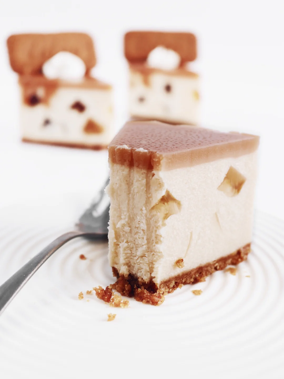 ❷焦糖饼干敲碎,与融化的黄油混合拌匀,铺入模具中并压实,入冰箱冷藏备用。