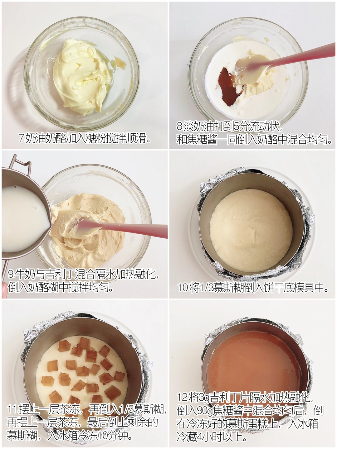 ❻3g吉利丁片隔水加热融化,倒入90g焦糖酱中混合均匀后,倒在冷冻好的慕斯蛋糕上,入冰箱冷藏4小时以上。