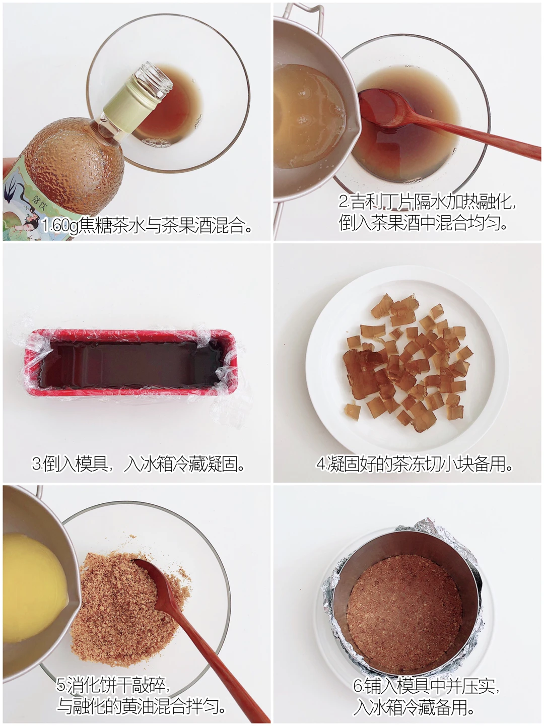 ❶焦糖茶包提前冲泡热水(可加适量的糖),取60g茶水与青梅茶果酒混合。吉利丁片隔水加热融化,倒入茶果酒中混合均匀,倒入模具入冰箱冷藏凝固后,切小块备用。