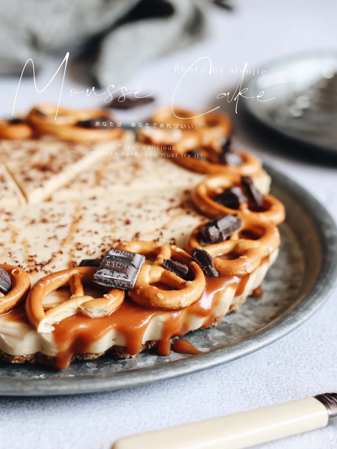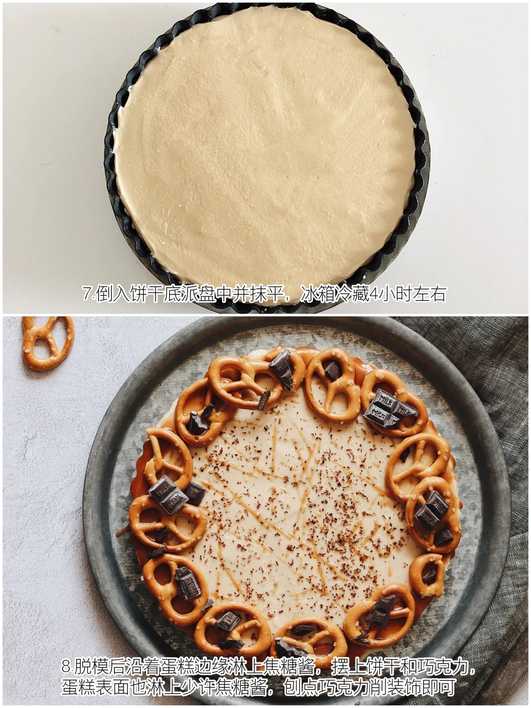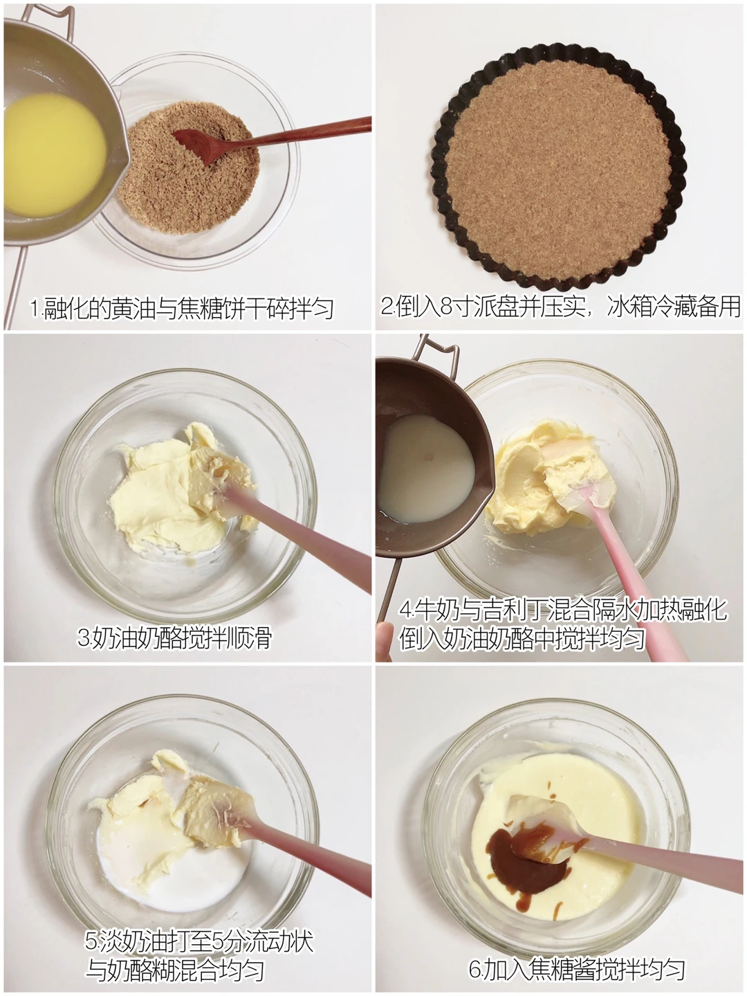 ❹加入焦糖酱搅拌均匀后,倒入饼干底派盘并抹平,入冰箱冷藏4小时左右。