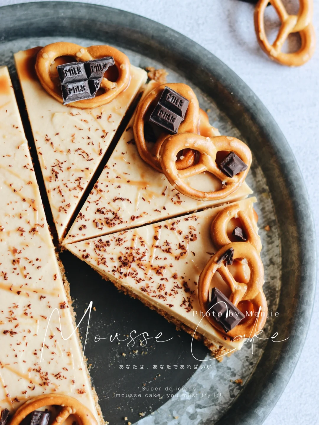 ❺膜模后沿着蛋糕边缘淋上焦糖酱,摆上饼干和巧克力。蛋糕表面也淋上少许焦糖酱,刨点巧克力削装饰即可。