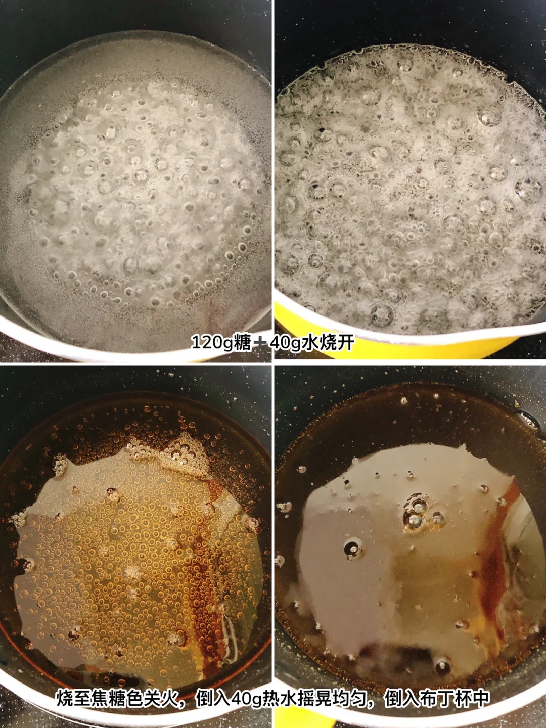 1. 细砂糖➕水烧开,烧至焦糖色关火,倒入热水,摇晃均匀,倒入布丁杯