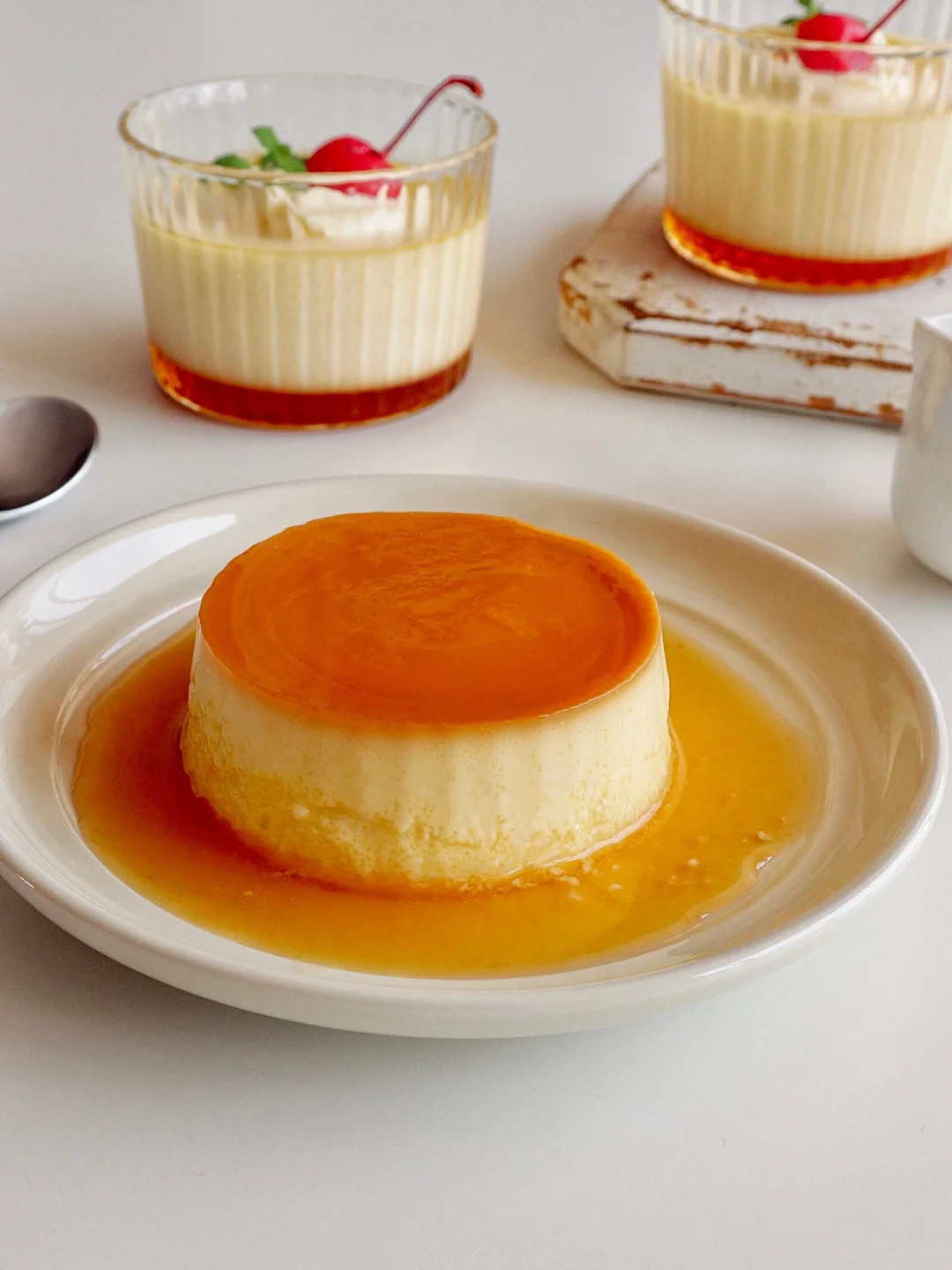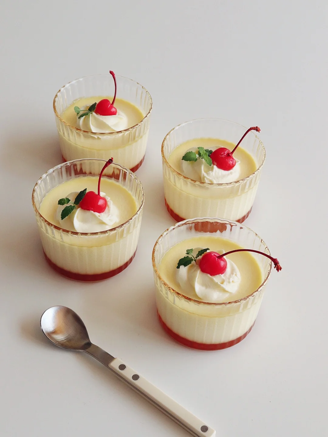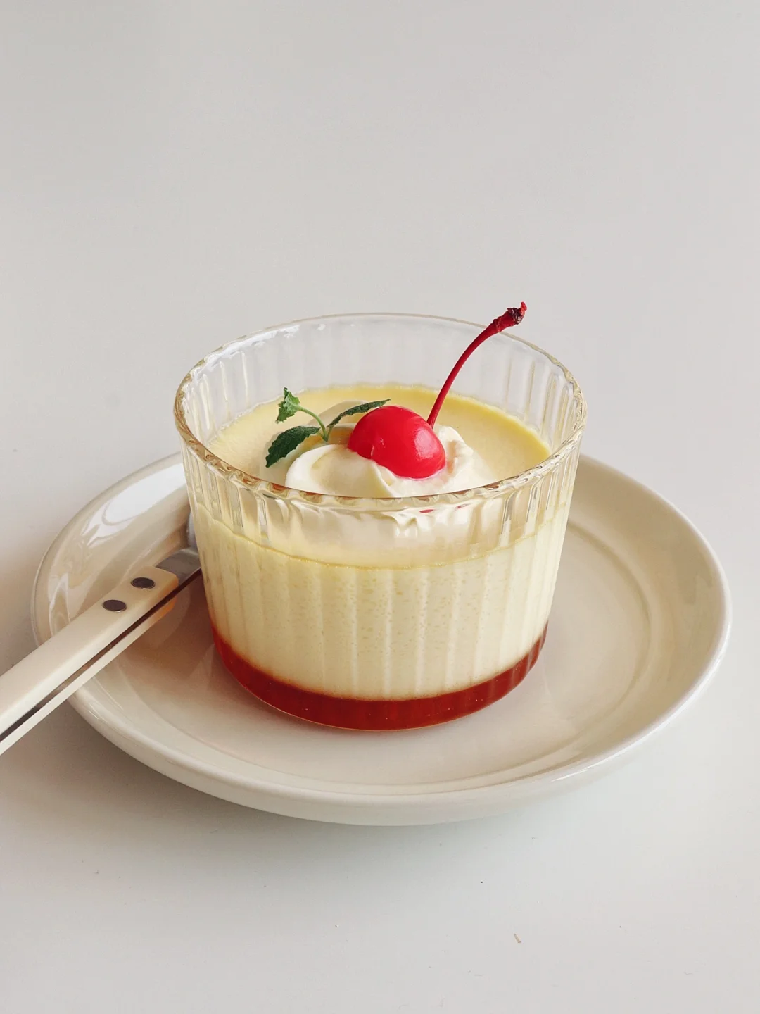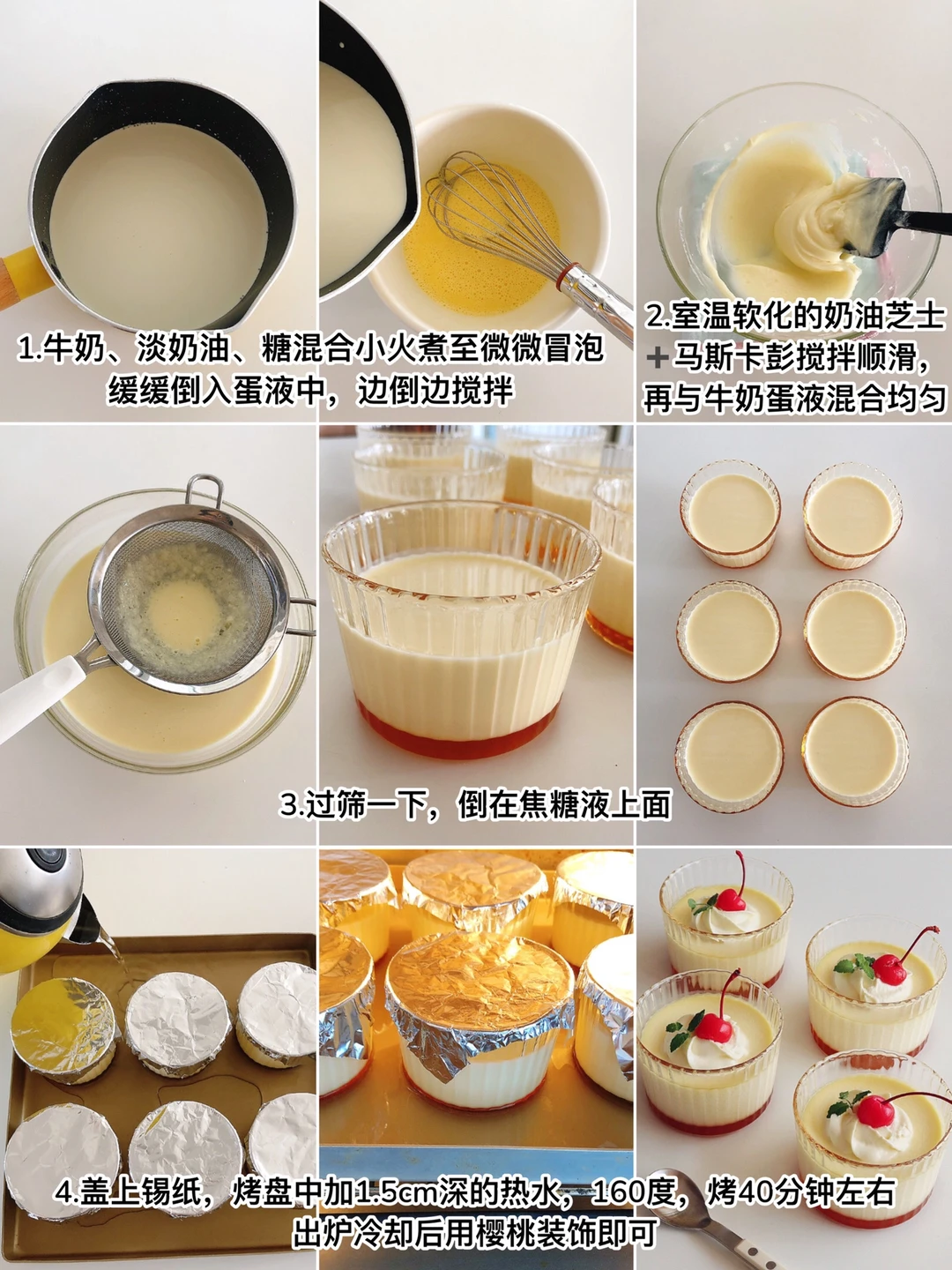 4. 倒在焦糖液上面,盖上锡纸,水浴法160度,烤40分钟左右,出炉冷却后用樱桃装饰即可