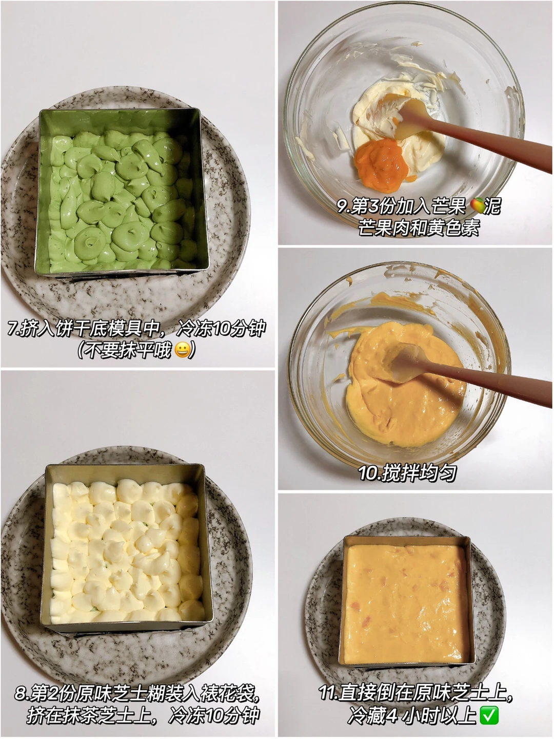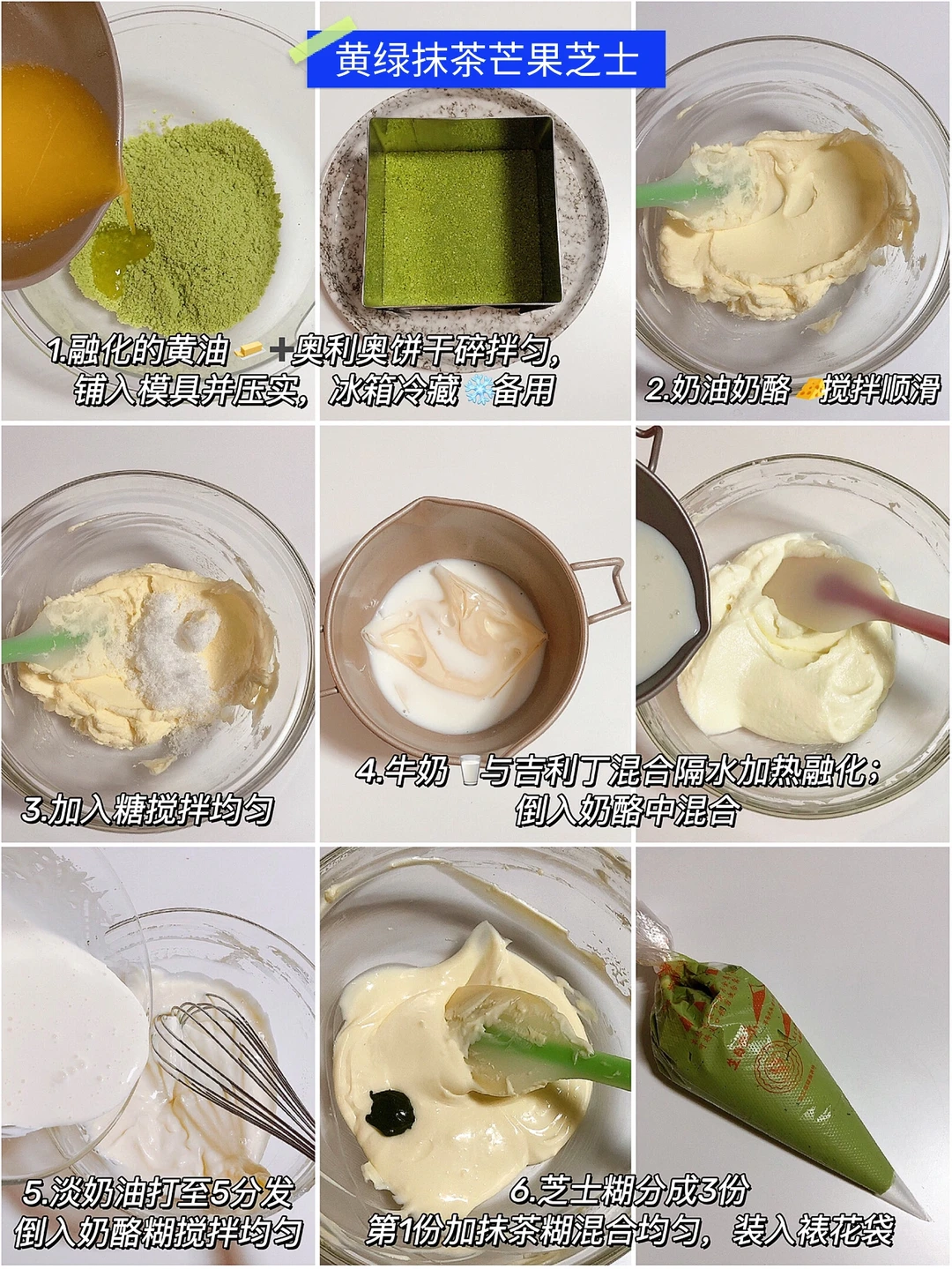 ✔️黄绿抹茶芒果芝士:(做法见图2️⃣和3️⃣)