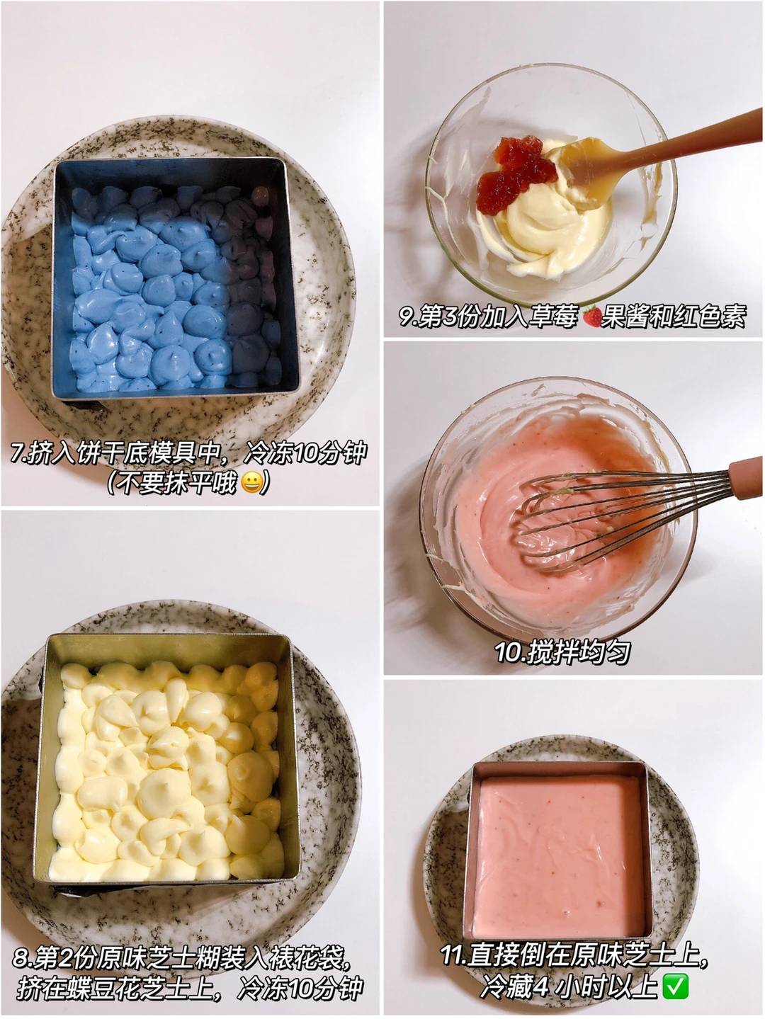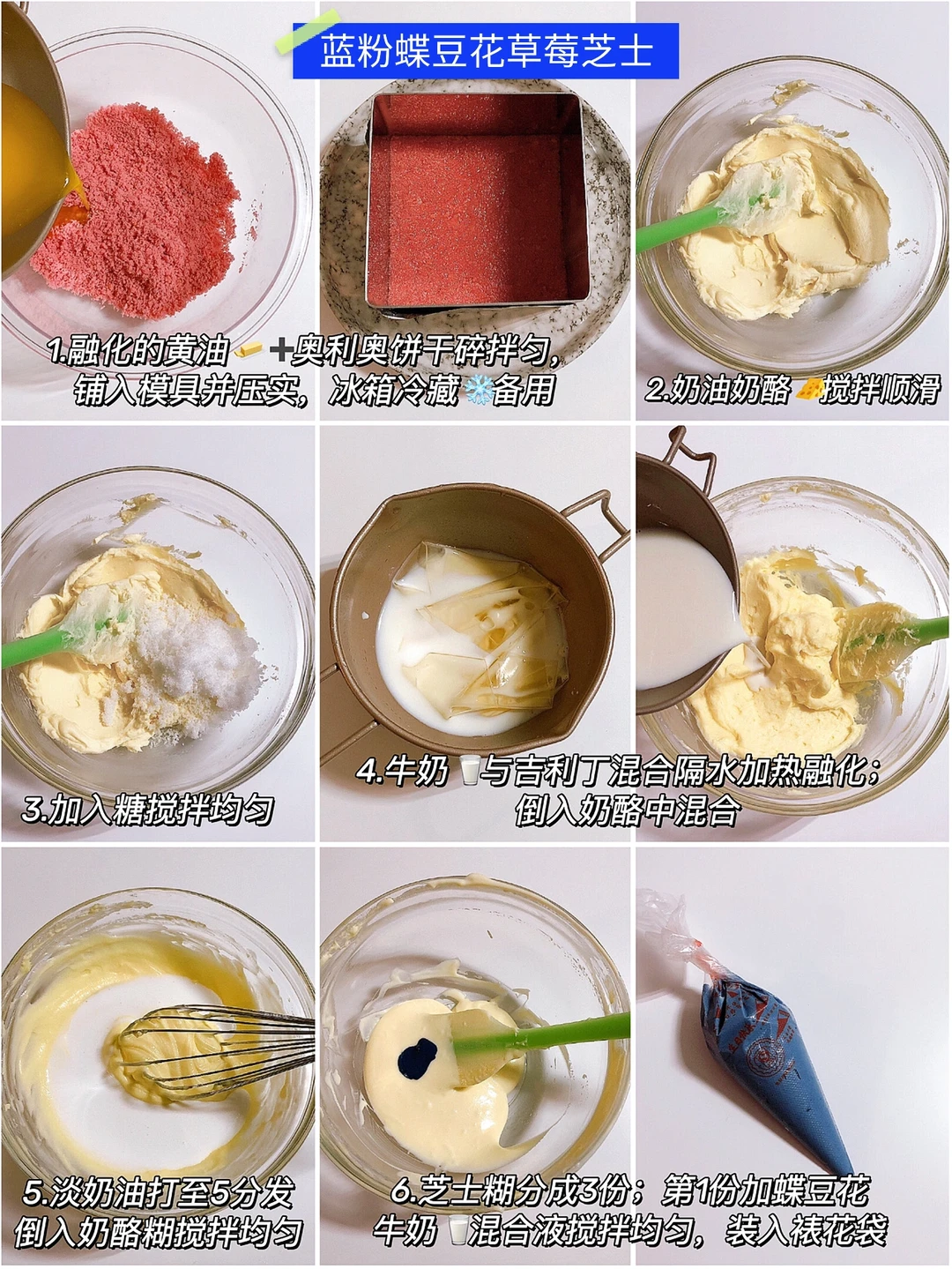 ✔️蓝粉蝶豆花草莓芝士:(做法见图4️⃣和5️⃣)