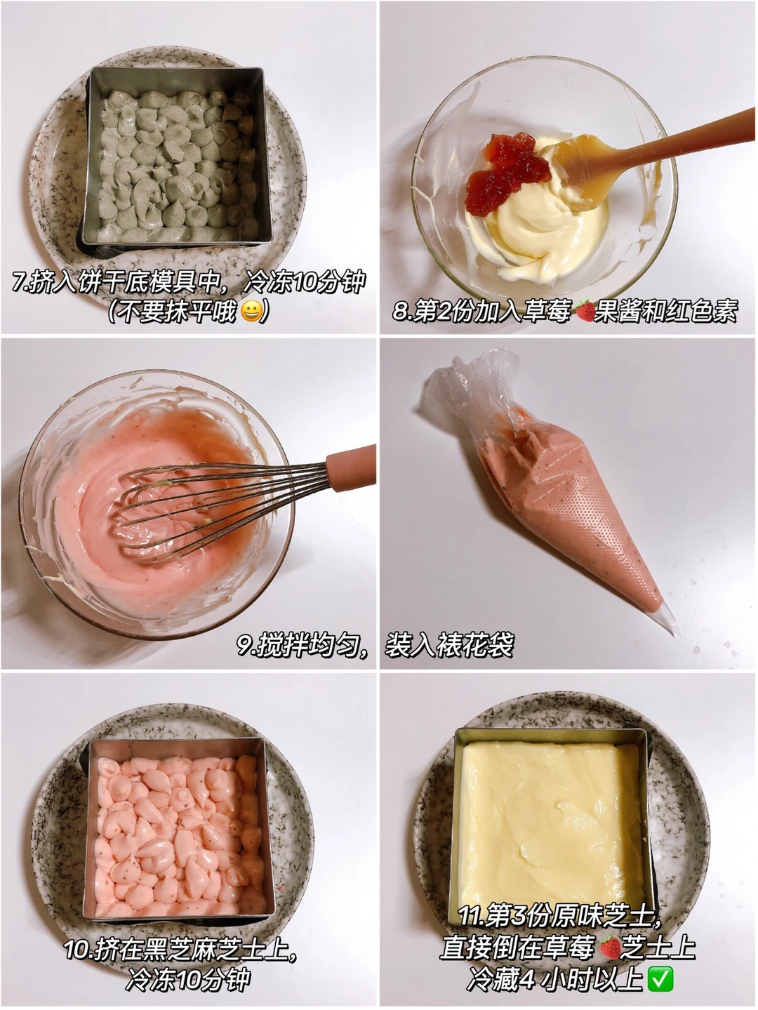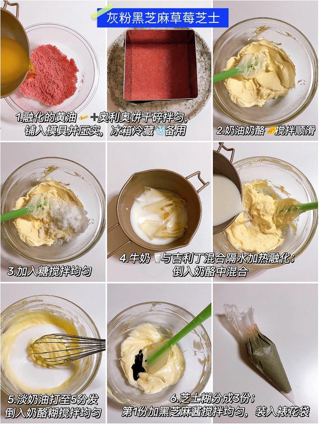 ✔️灰粉黑芝麻草莓芝士:(做法见图6️⃣和7️⃣)