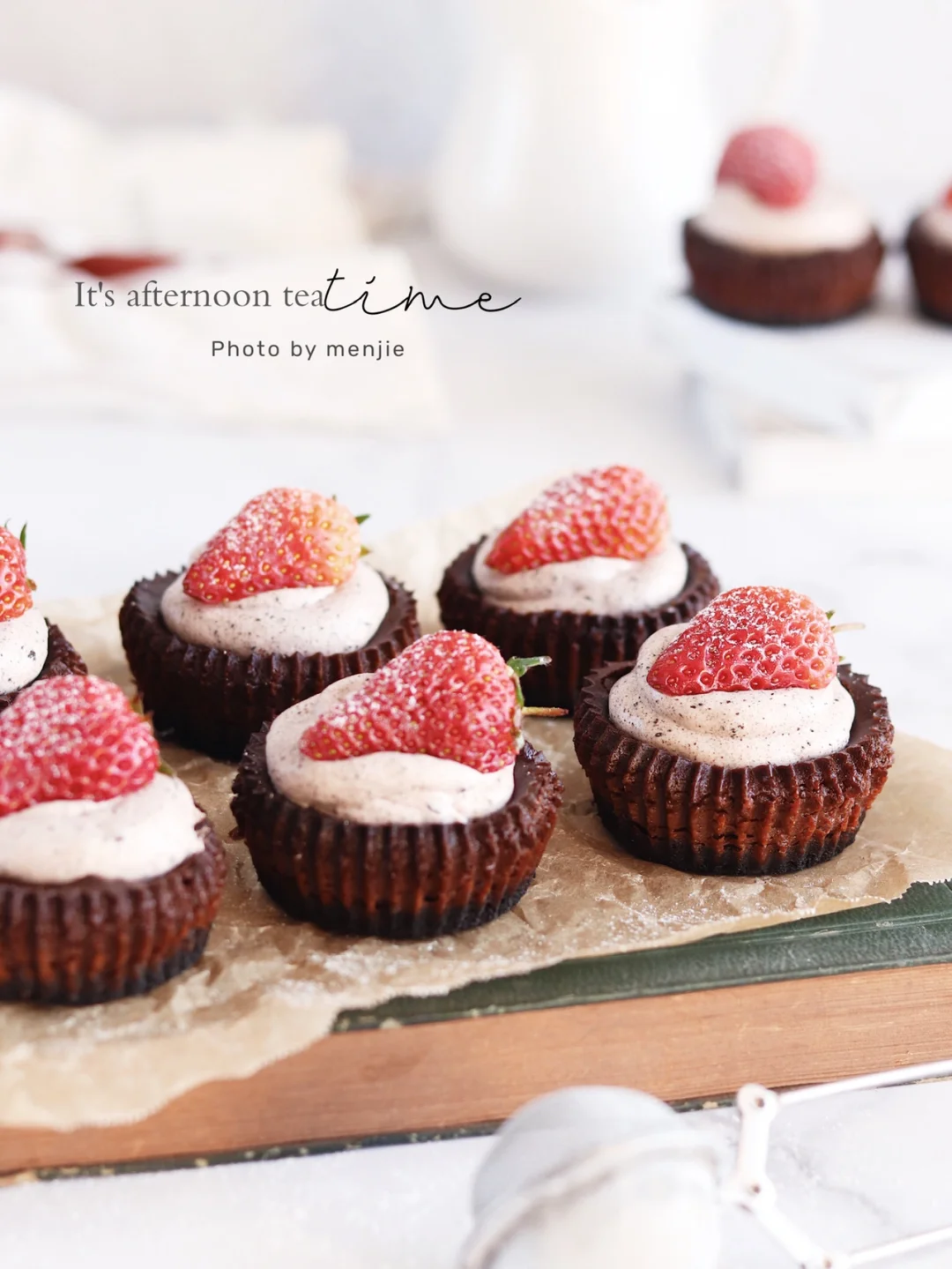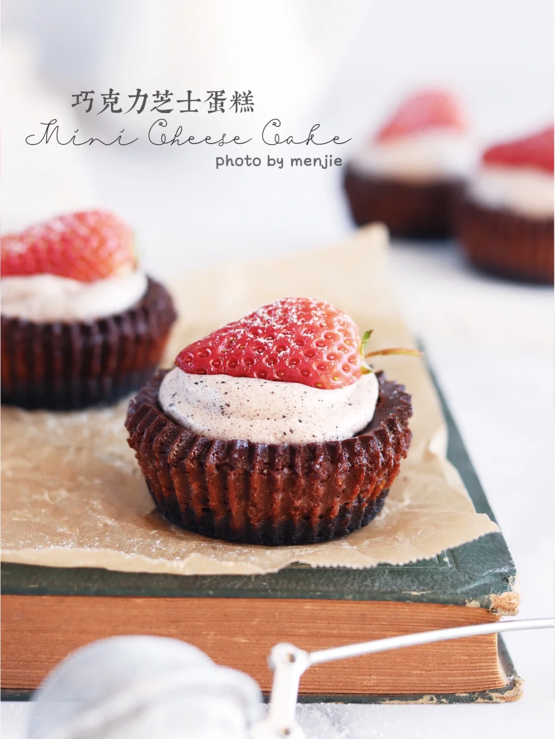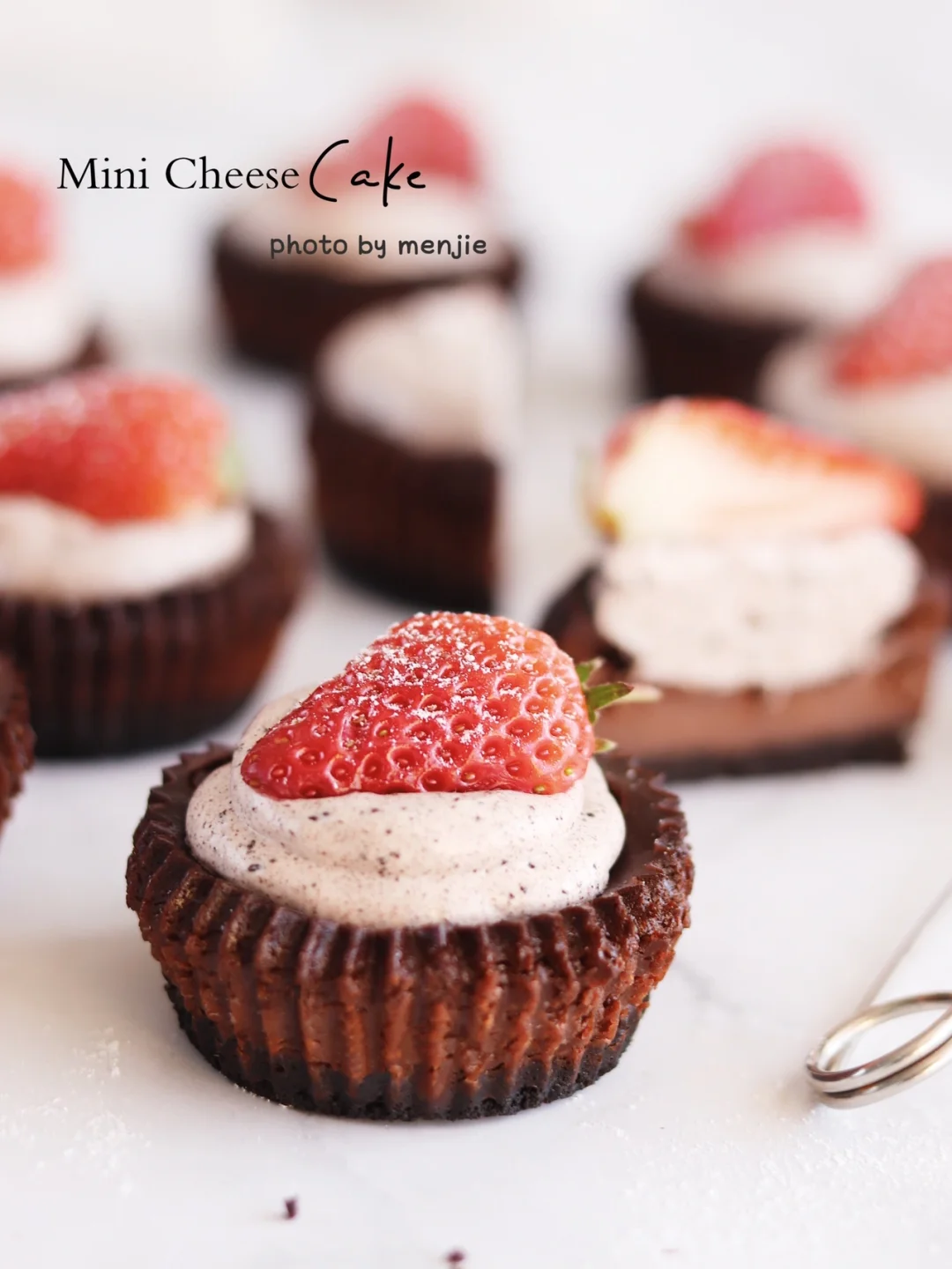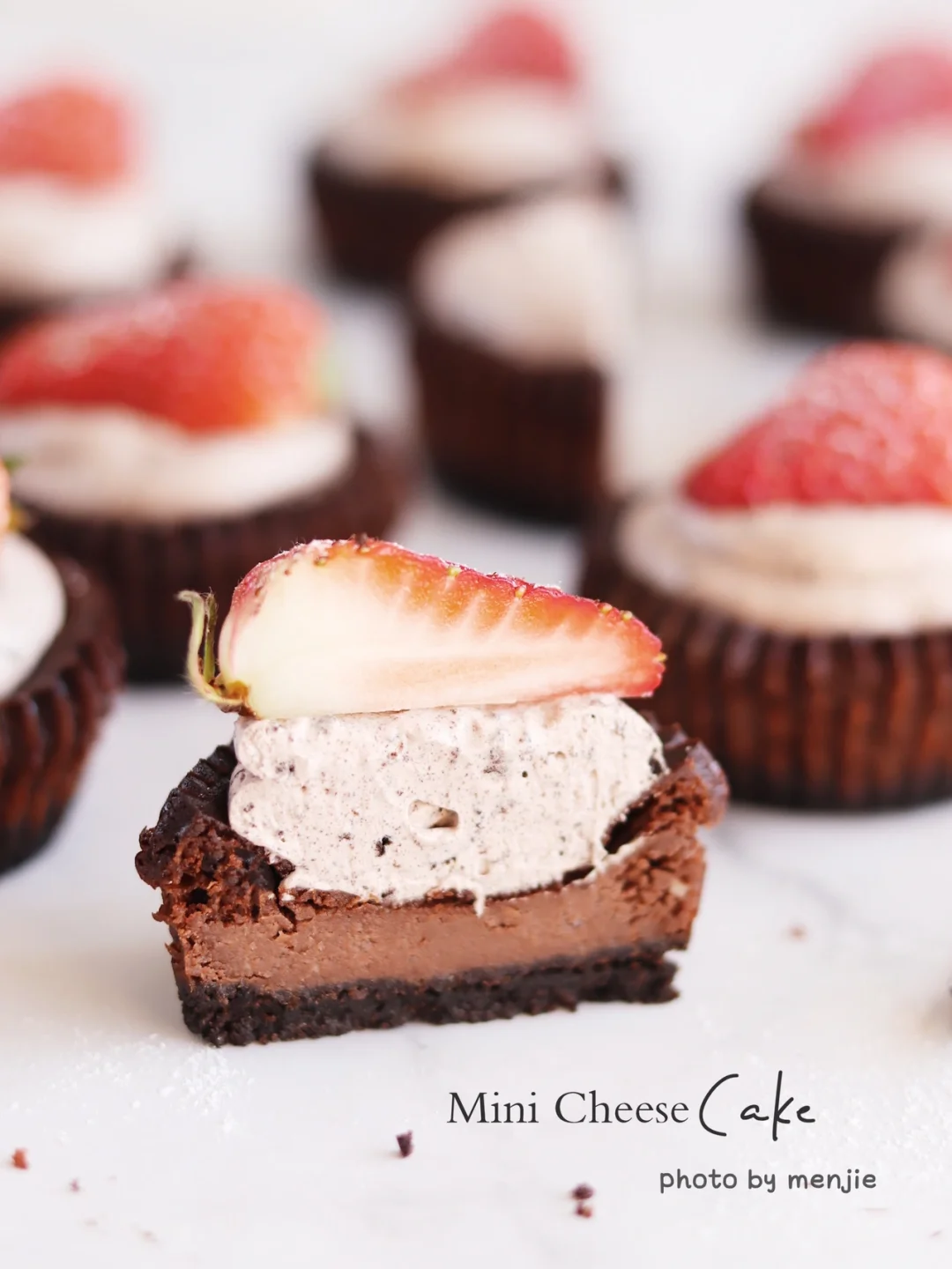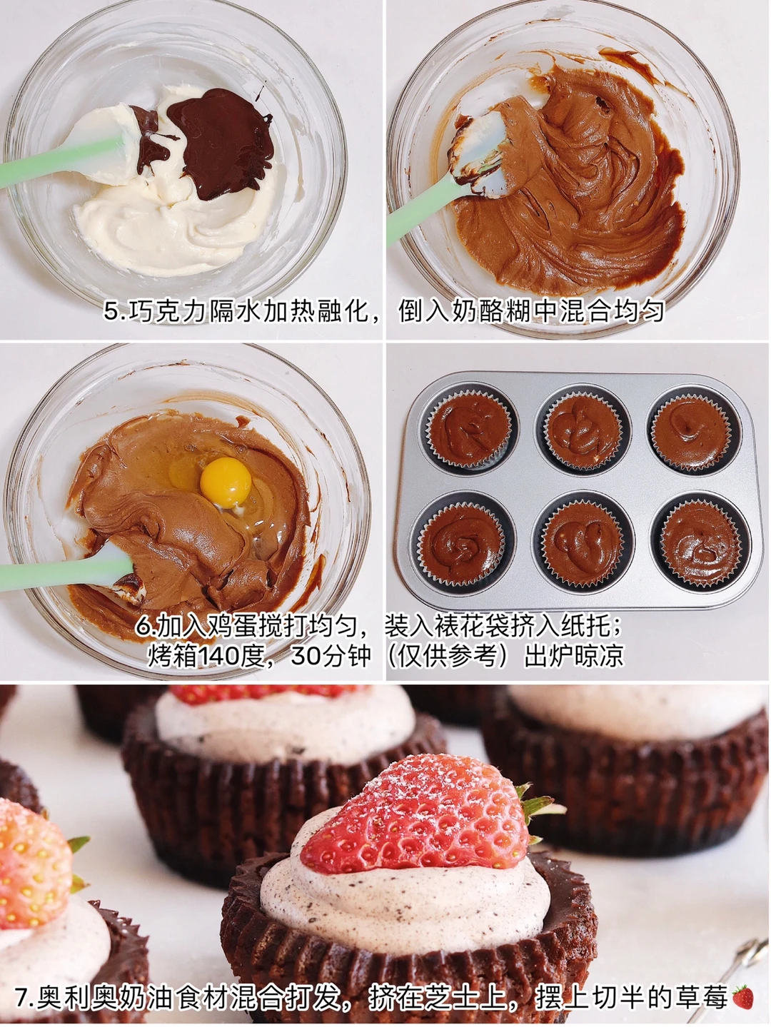 ❼奥利奥奶油食材混合打发挤在芝士上,再摆上切半的草莓,筛一点糖粉装饰就好了