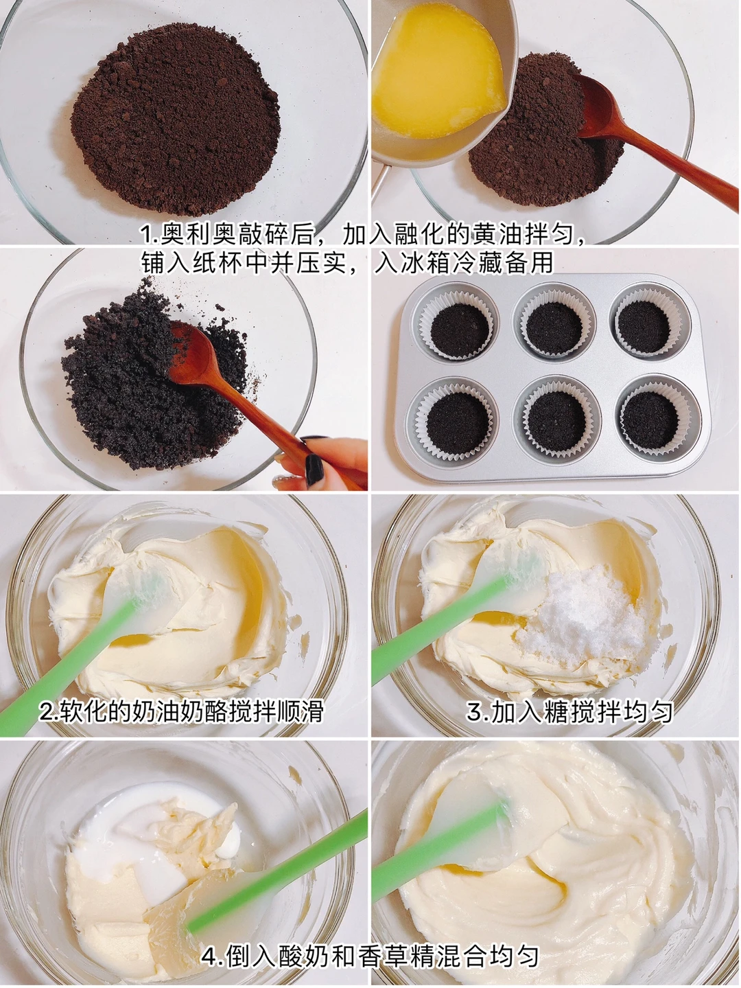 ❶奥利奥敲碎,加入融化的黄油拌匀,铺入纸杯中并压实,入冰箱冷藏备用
