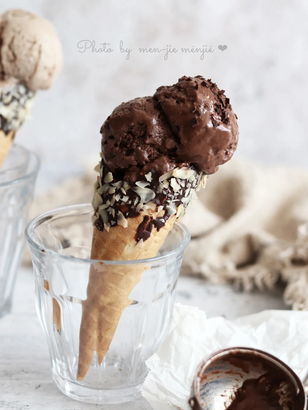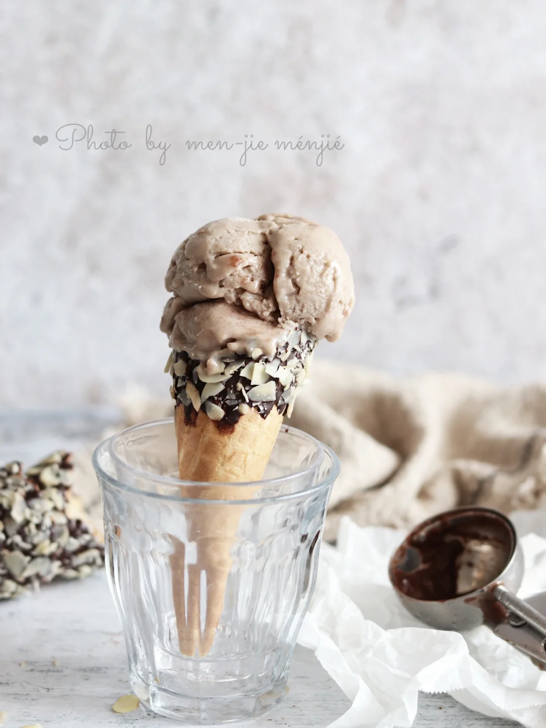 ❸冻好的冰淇淋挖成球放到脆筒里开吃。