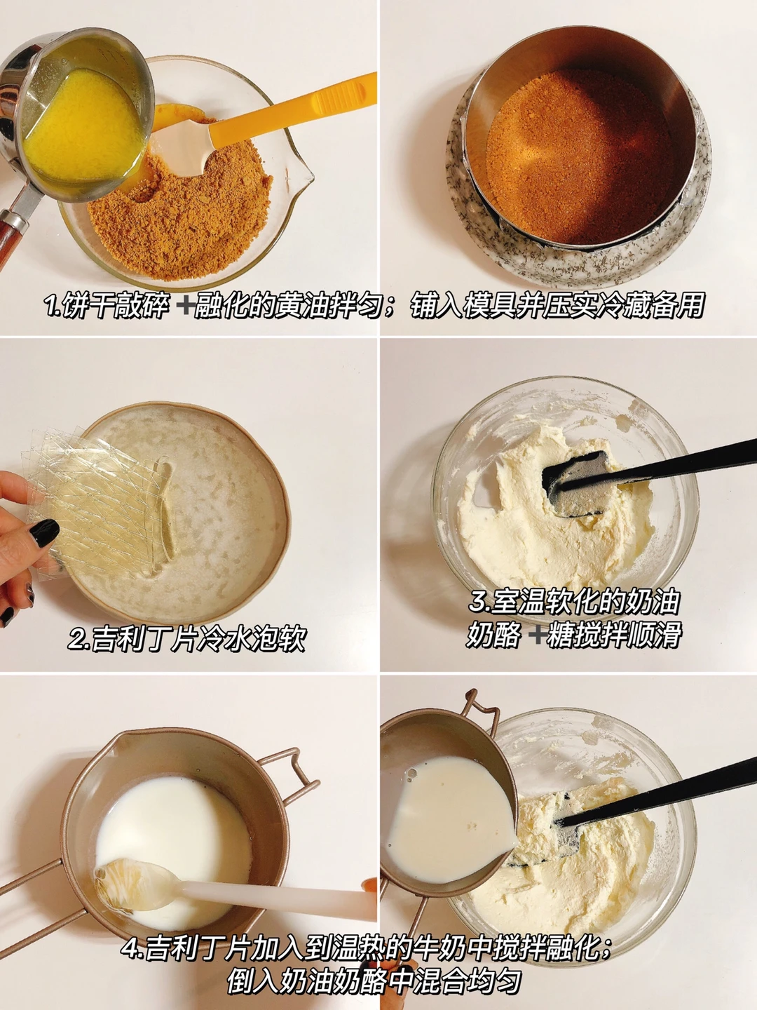 ❶饼干敲碎,加入融化的黄油拌匀