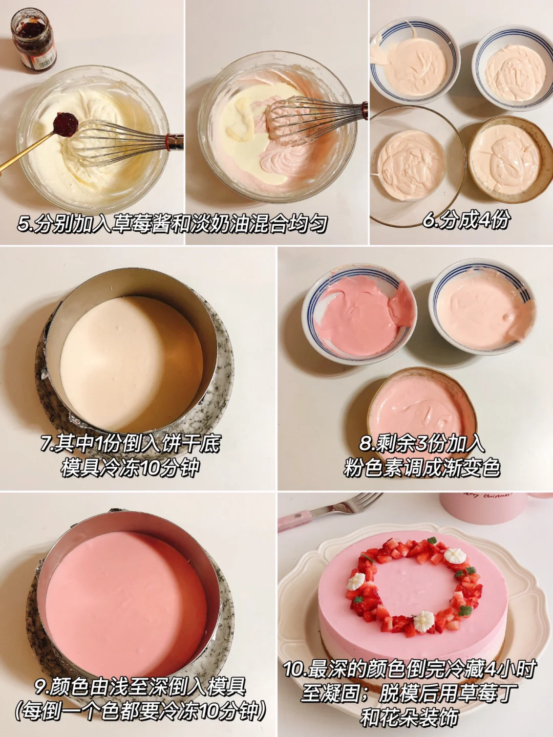 ❺剩余的3份加入粉色素,调成渐变色