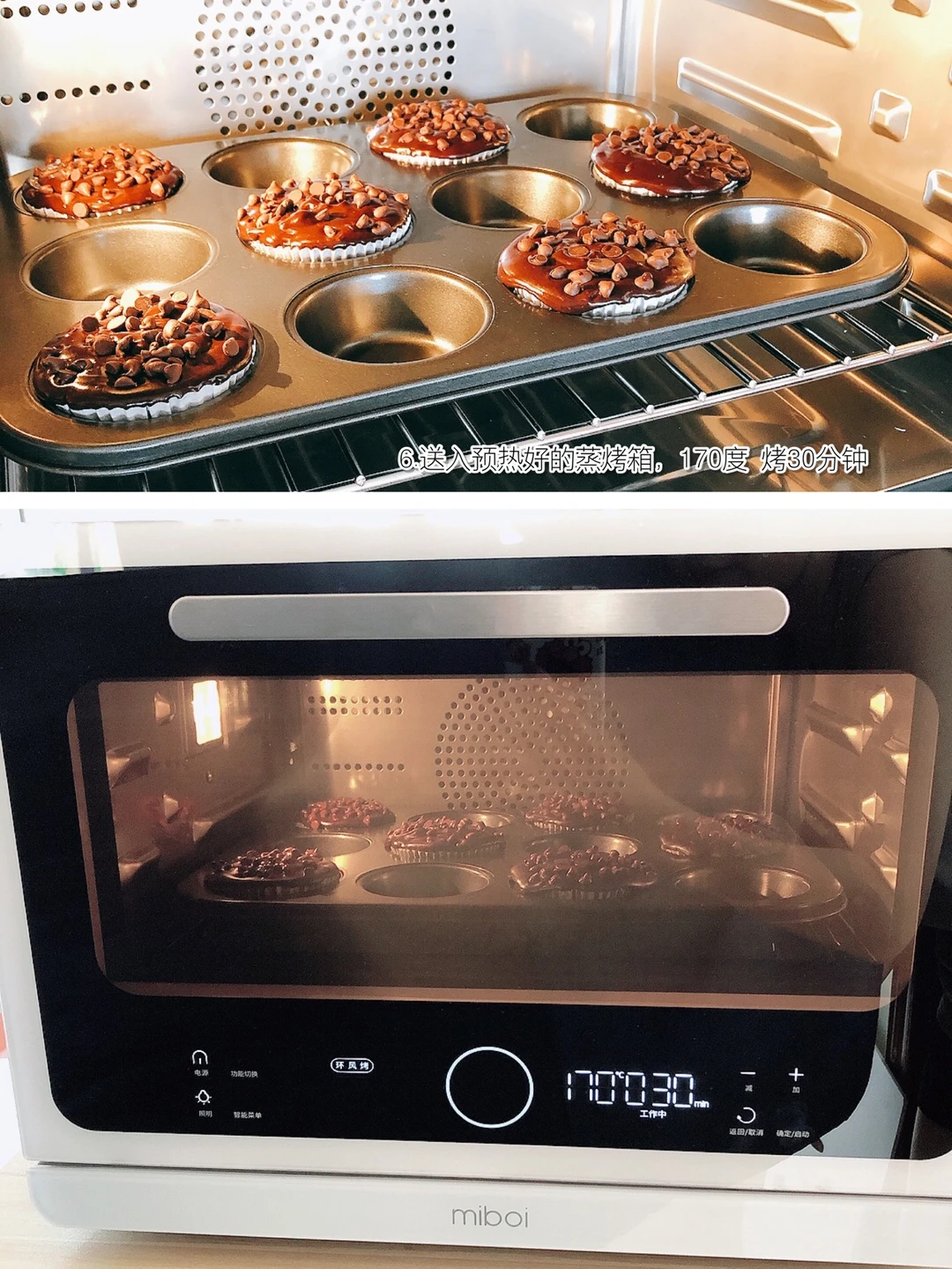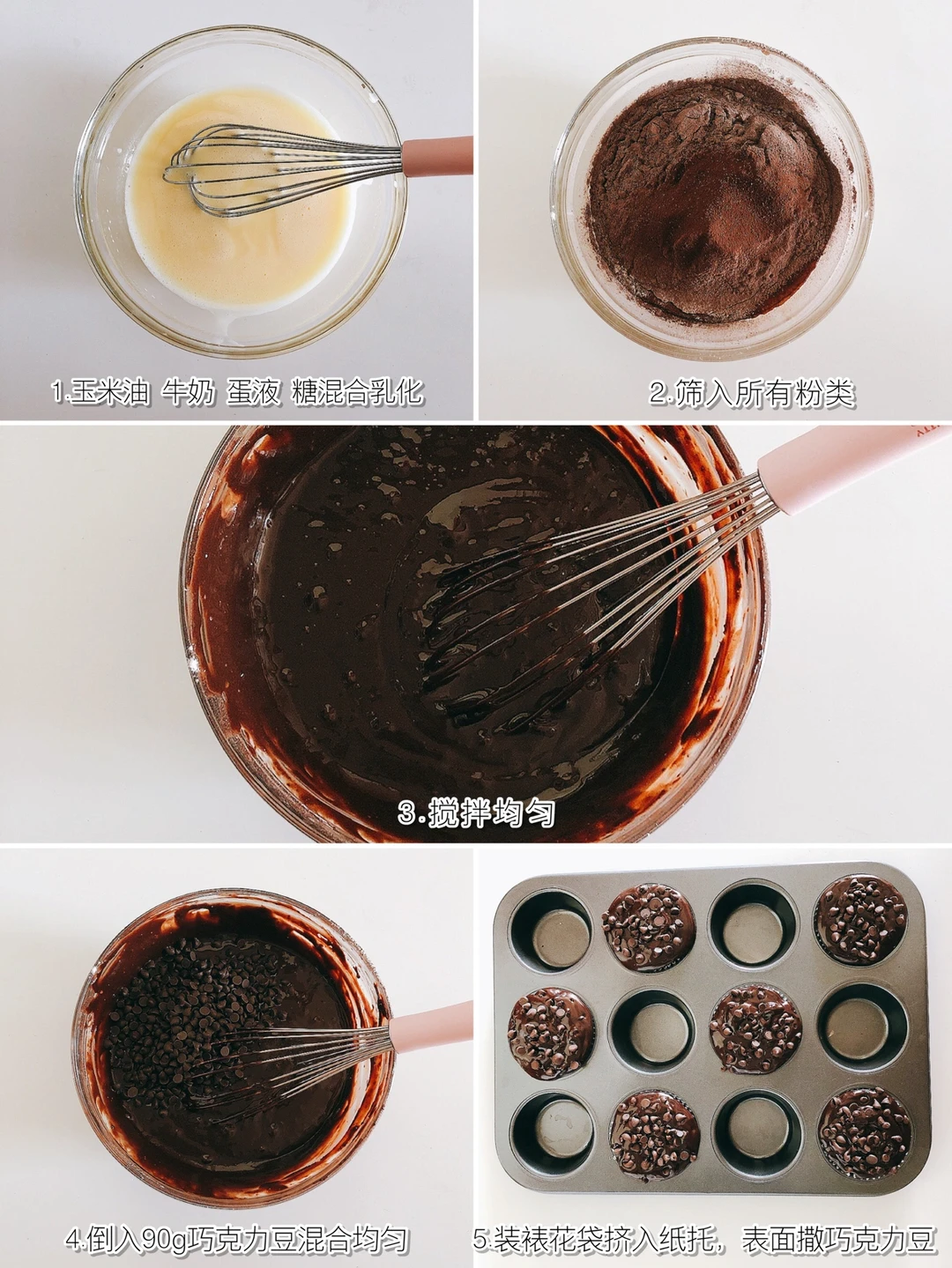 ❸面糊里加入90g巧克力豆翻拌均匀,装入裱花袋,挤入纸托11分满,表面撒耐高温巧克力豆。