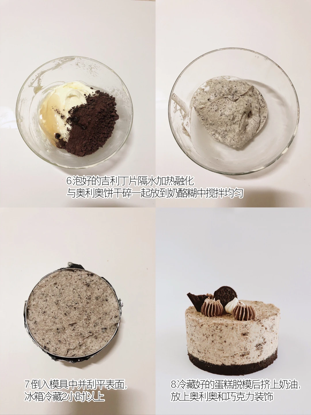 ❻倒入模具并刮平表面,冷藏两小时以上。脱模后表面挤上奶油(淡奶油加点奥利奥饼干碎打发),摆上巧克力和奥利奥装饰即可。