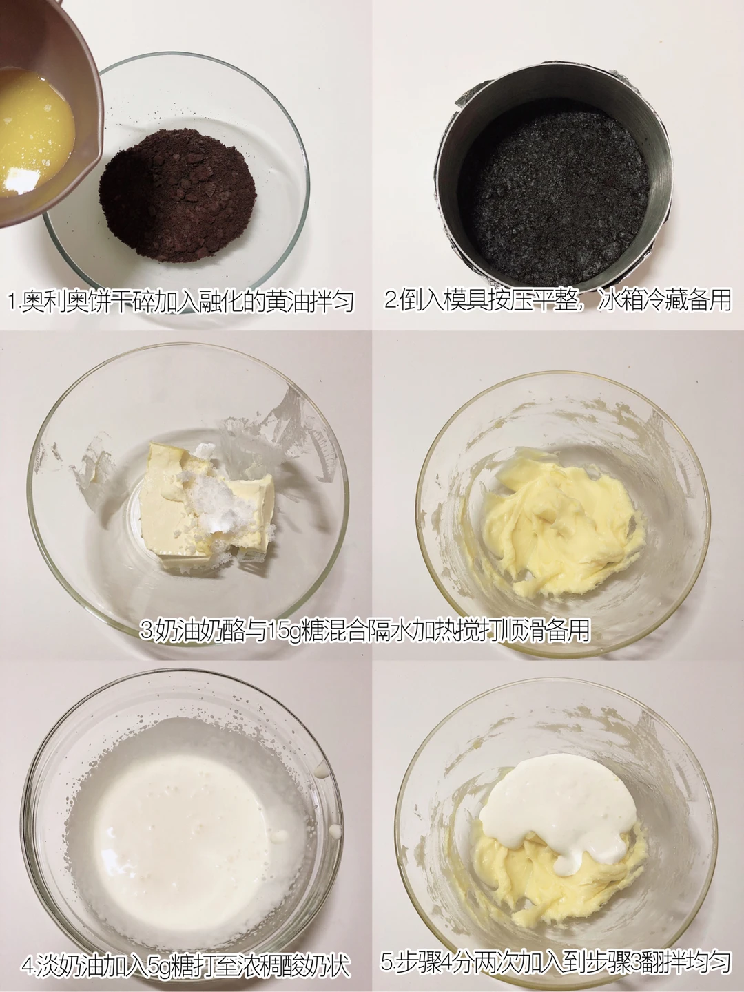 ❷做饼干底:黄油隔水融化,倒入50g的奥利奥饼干碎中拌匀。铺入模具底部并按压平整,送入冰箱冷藏备用。
