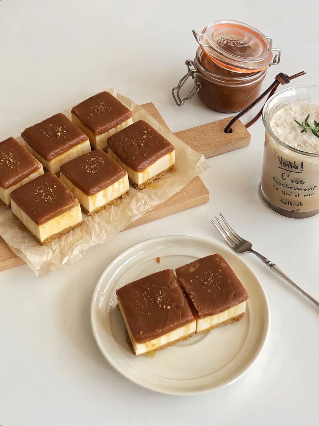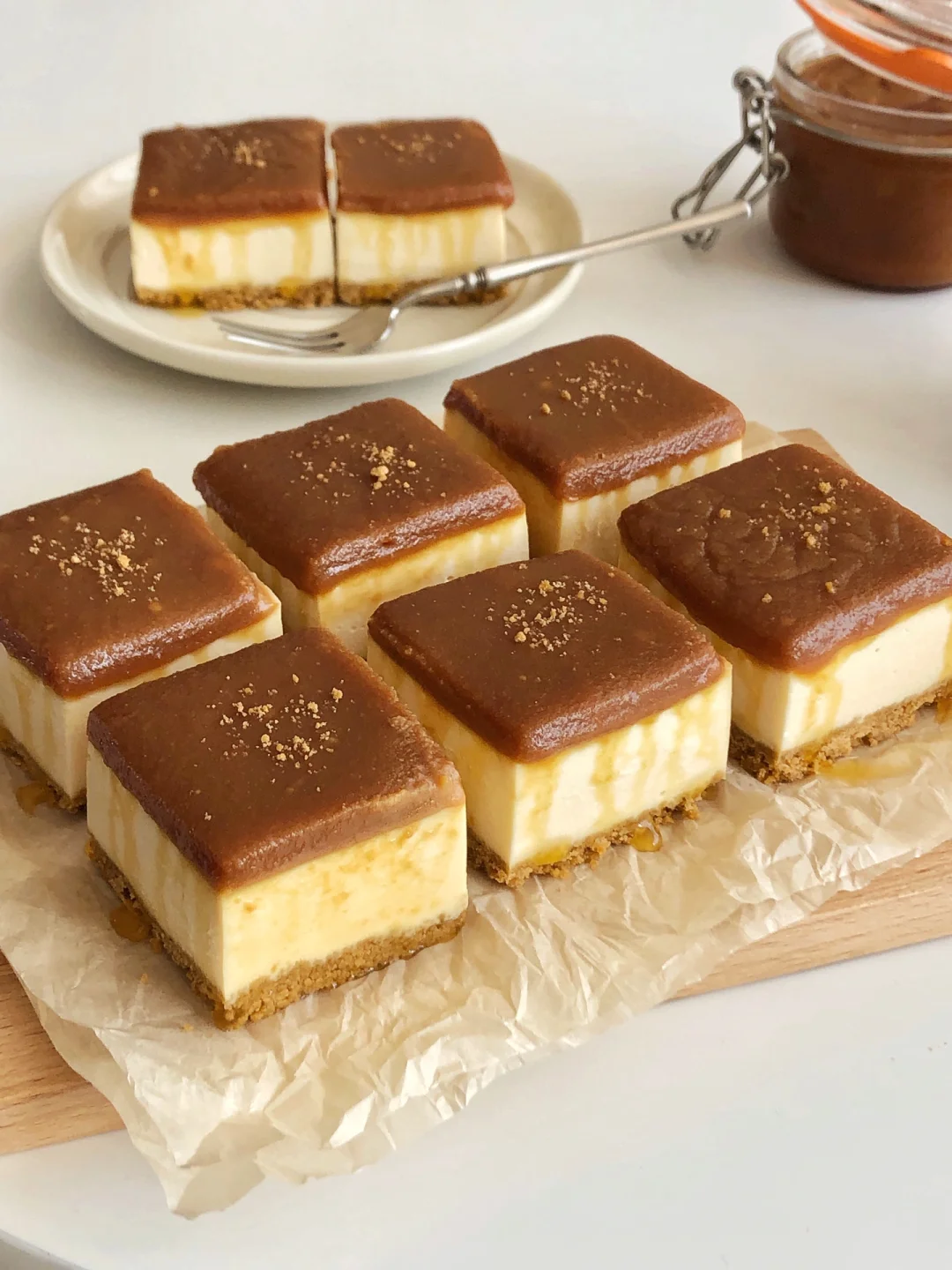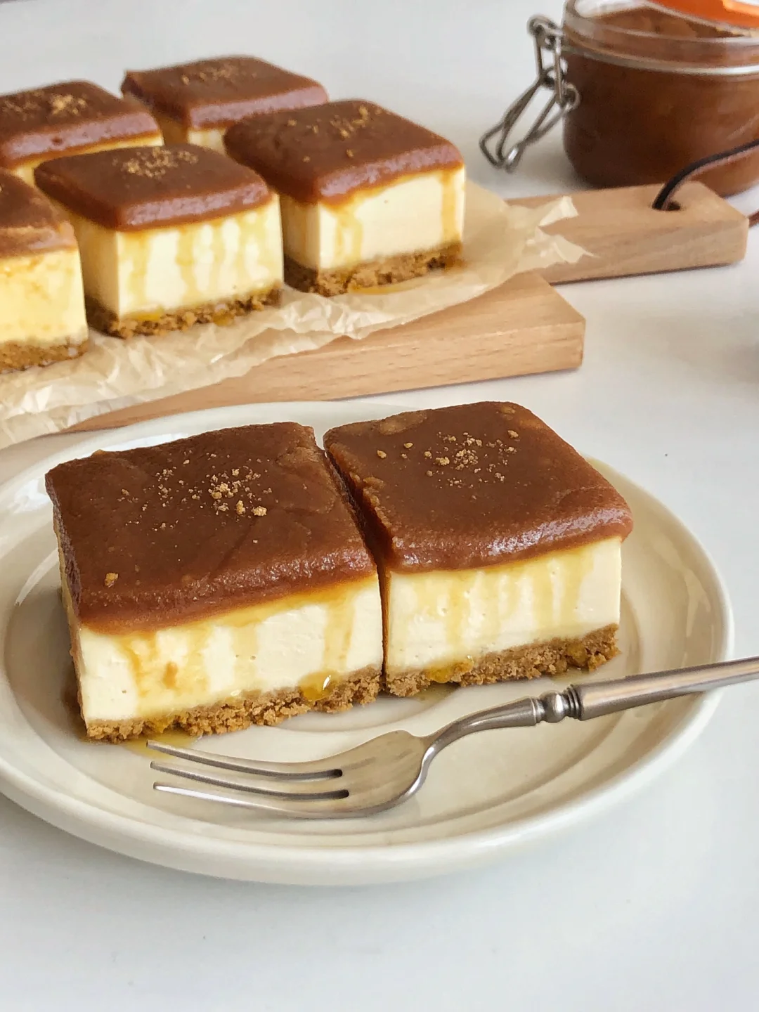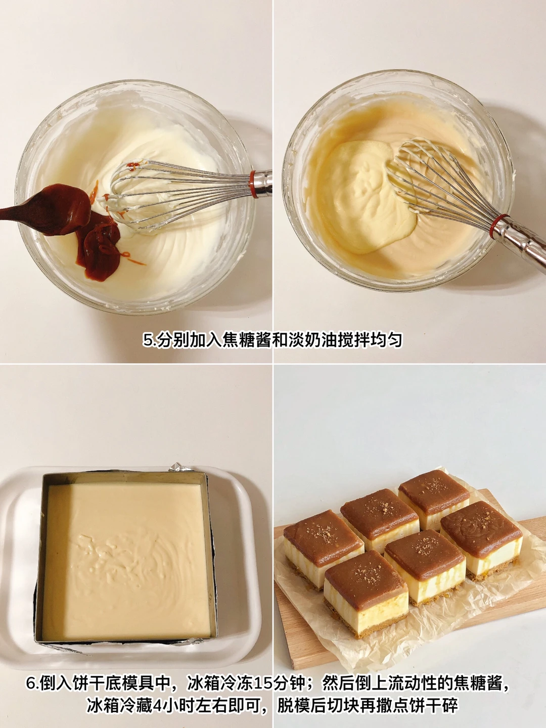 6️⃣再倒上流动性的焦糖酱,冰箱冷藏4小时以上。脱模后切块,再撒点饼干碎即可