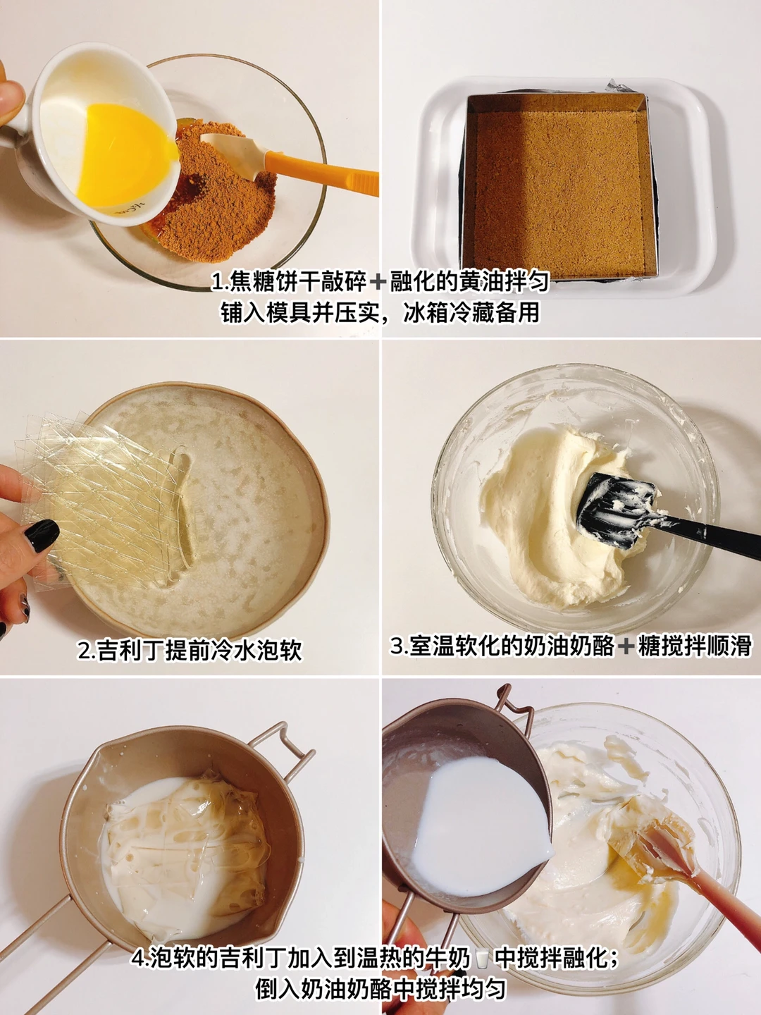 1️⃣焦糖饼干敲碎➕融化的黄油拌匀,铺入模具并压实,冰箱冷藏备用