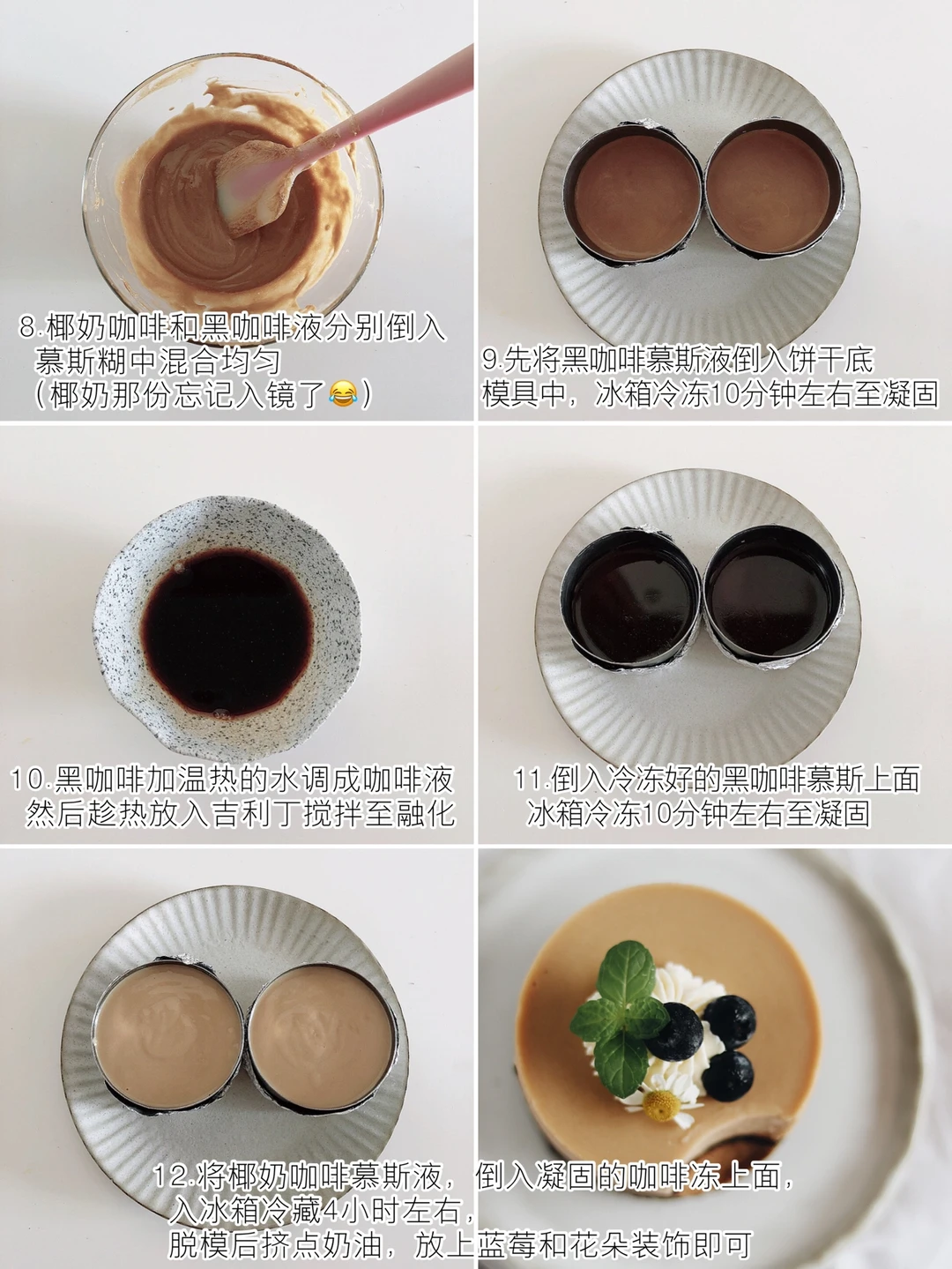 ❼将椰奶咖啡慕斯液倒入凝固的咖啡冻上,入冰箱冷藏4小时左右。脱模后挤一点奶油,放上蓝莓和花朵装饰。