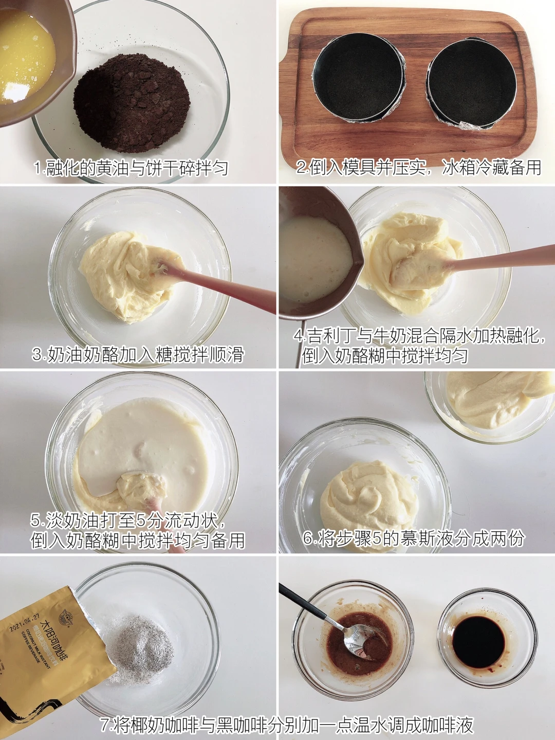 ❶奥利奥碎与融化的黄油拌均,倒入模具并压实,冰箱冷藏备用。