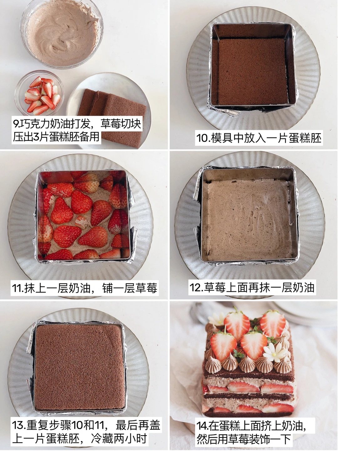 ❾重复步骤8,在上面盖上蛋糕胚冷藏两小时后,挤奶油花,装饰上草莓即可