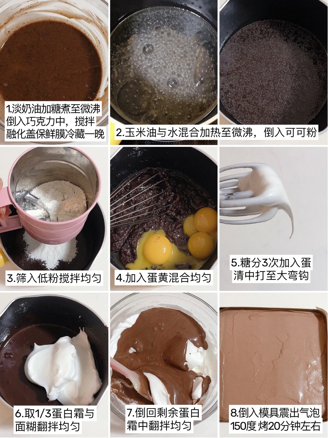 ❷玉米油与水混合加热至微沸,加入可可粉搅拌均匀
