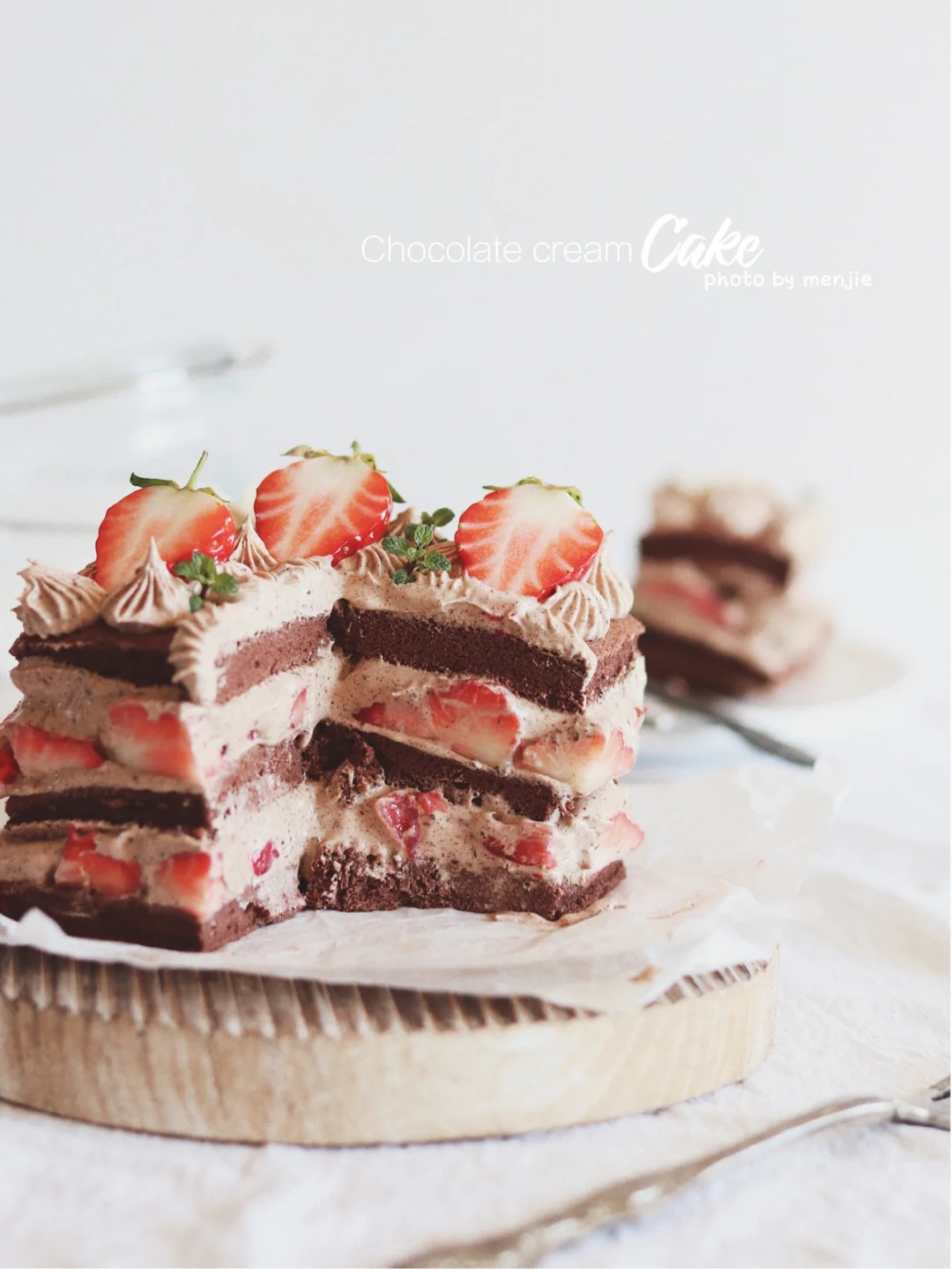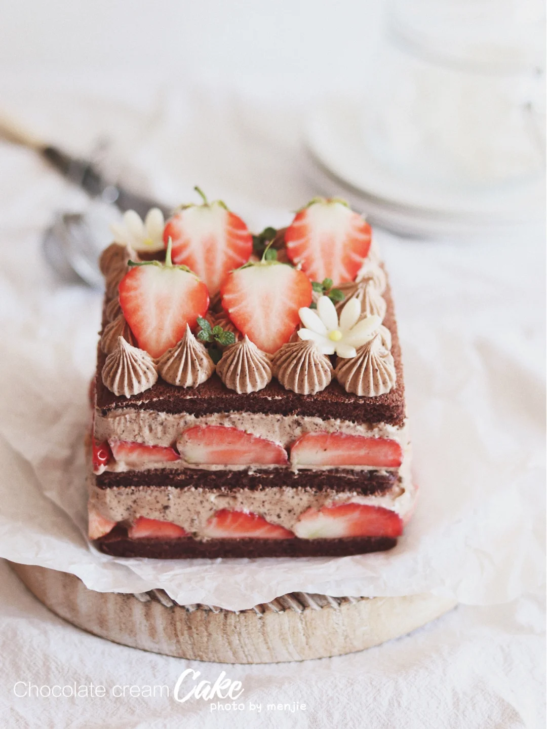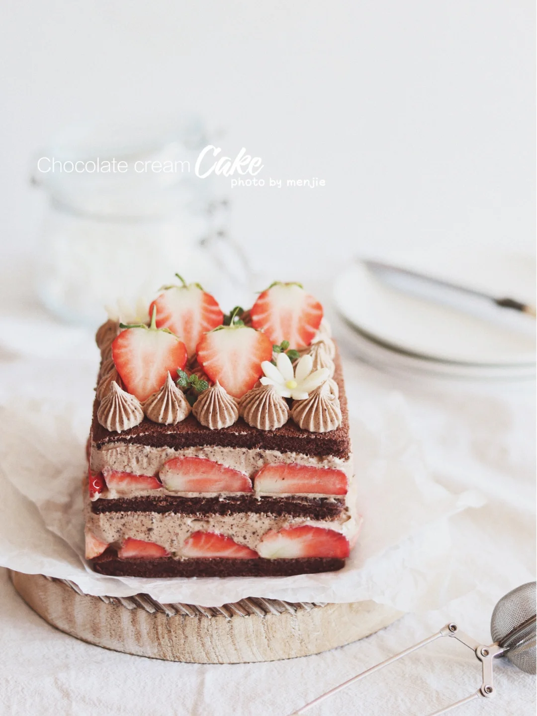 巧克力控们看过来,这是我自己很喜欢的巧克力香缇奶油,再配上酸酸甜甜的草莓和绵密的蛋糕,真的是一口就沦陷掉了[偷笑R]