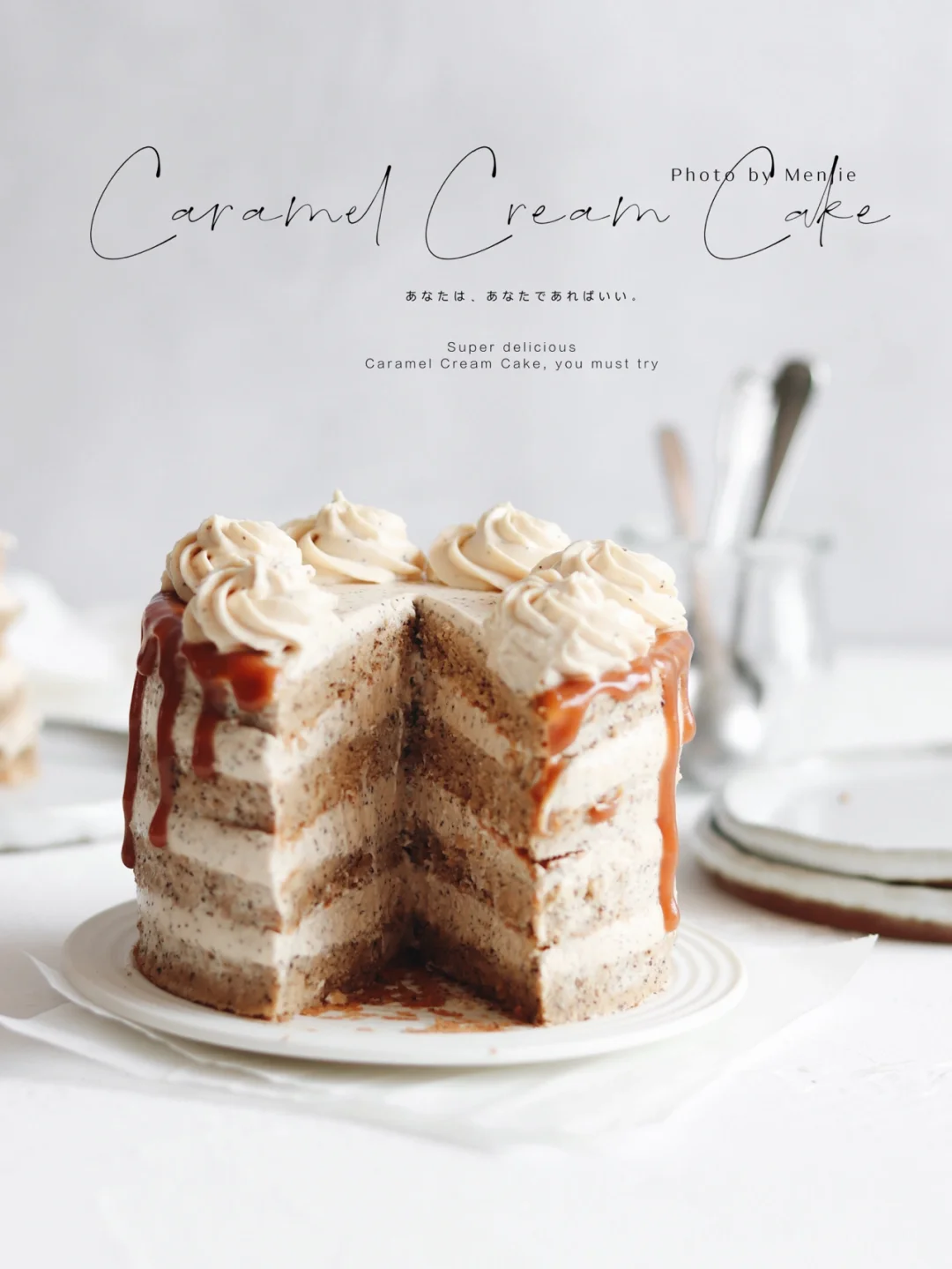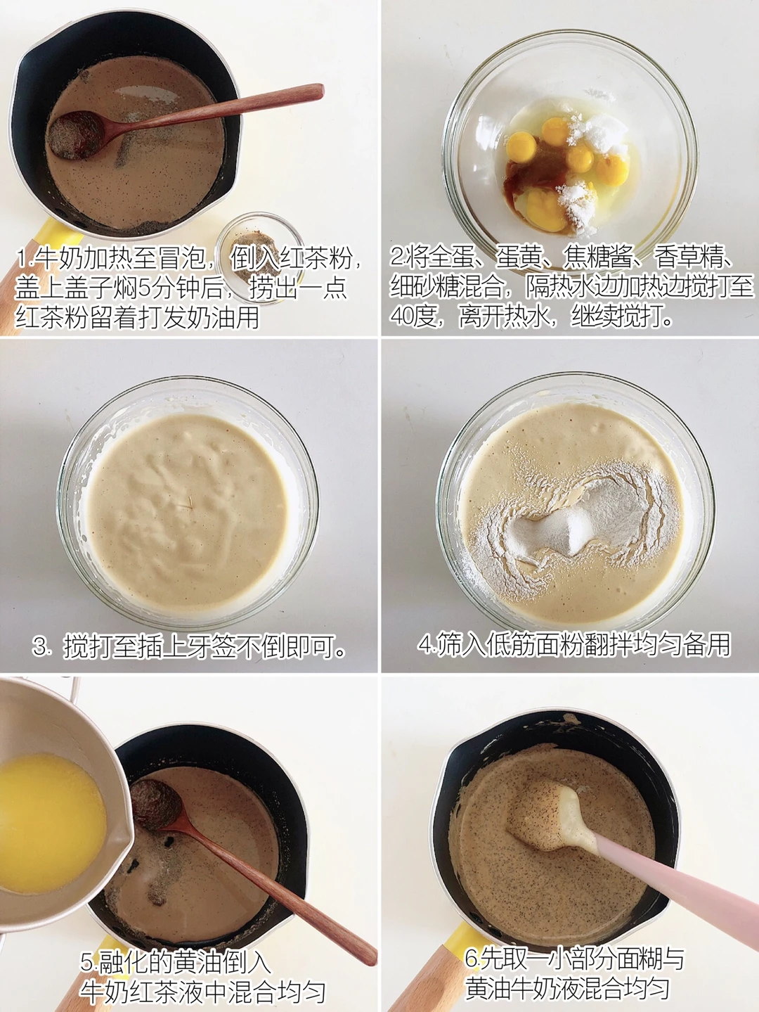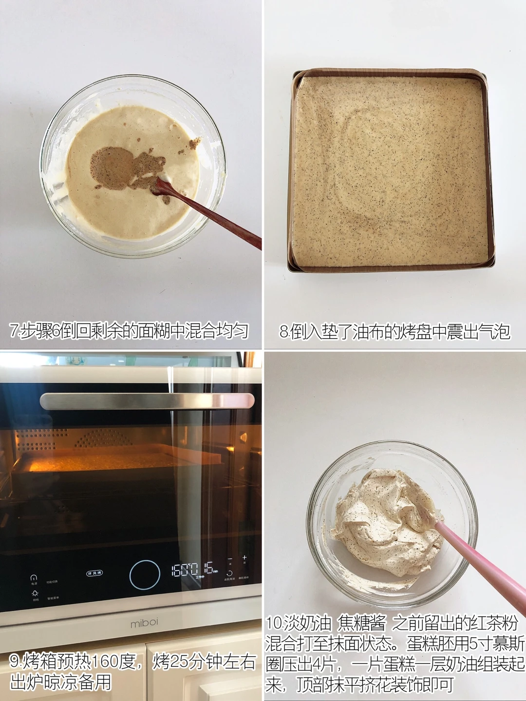 ❼将淡奶油、焦糖酱与之前留出的红茶粉混合打发至抹面状态。晾凉的蛋糕胚用5寸慕斯圈压出4片。然后按一片蛋糕一层奶油这样组装起来,顶部也抹上奶油,再挤上花装饰一下即可。