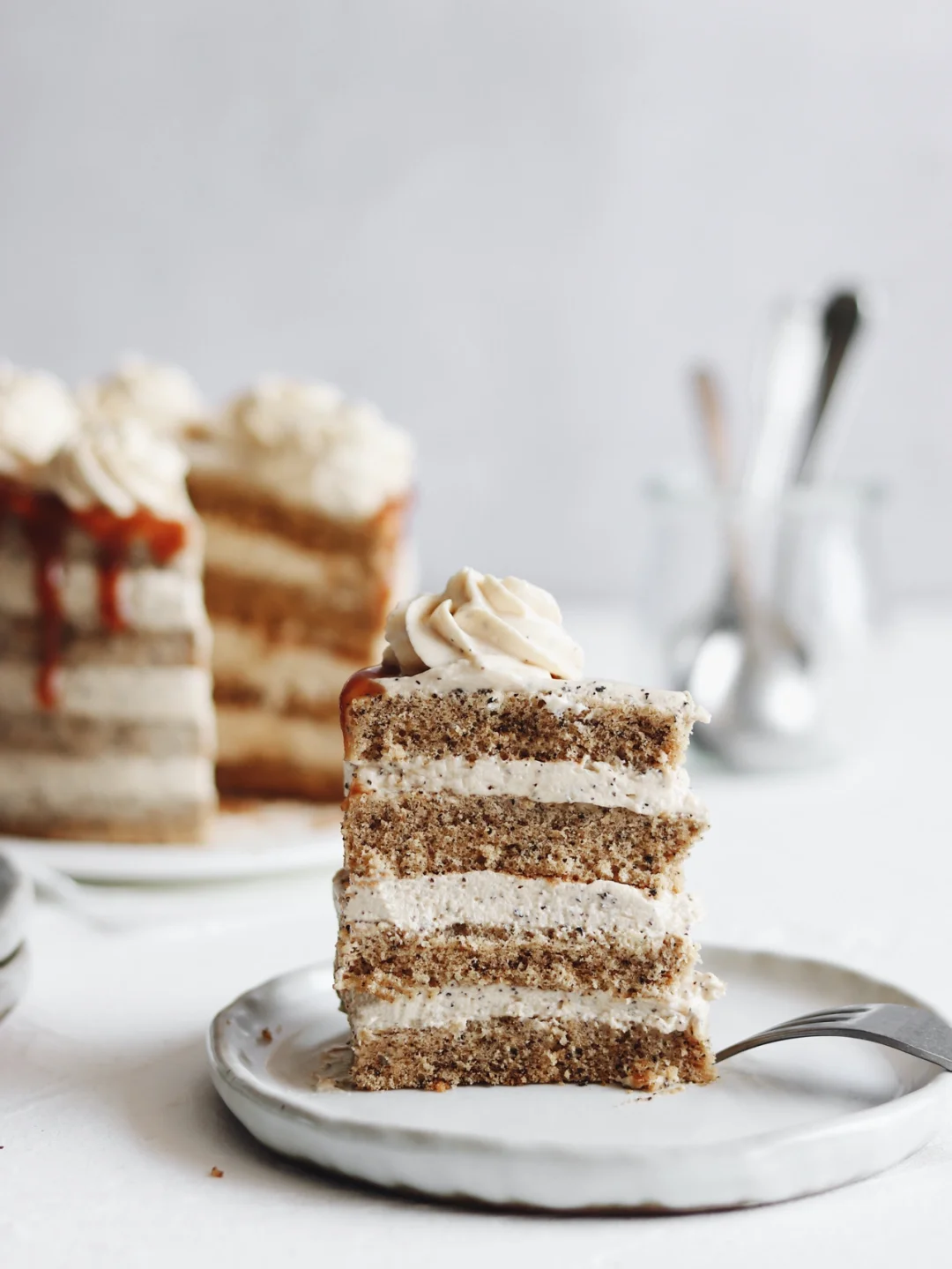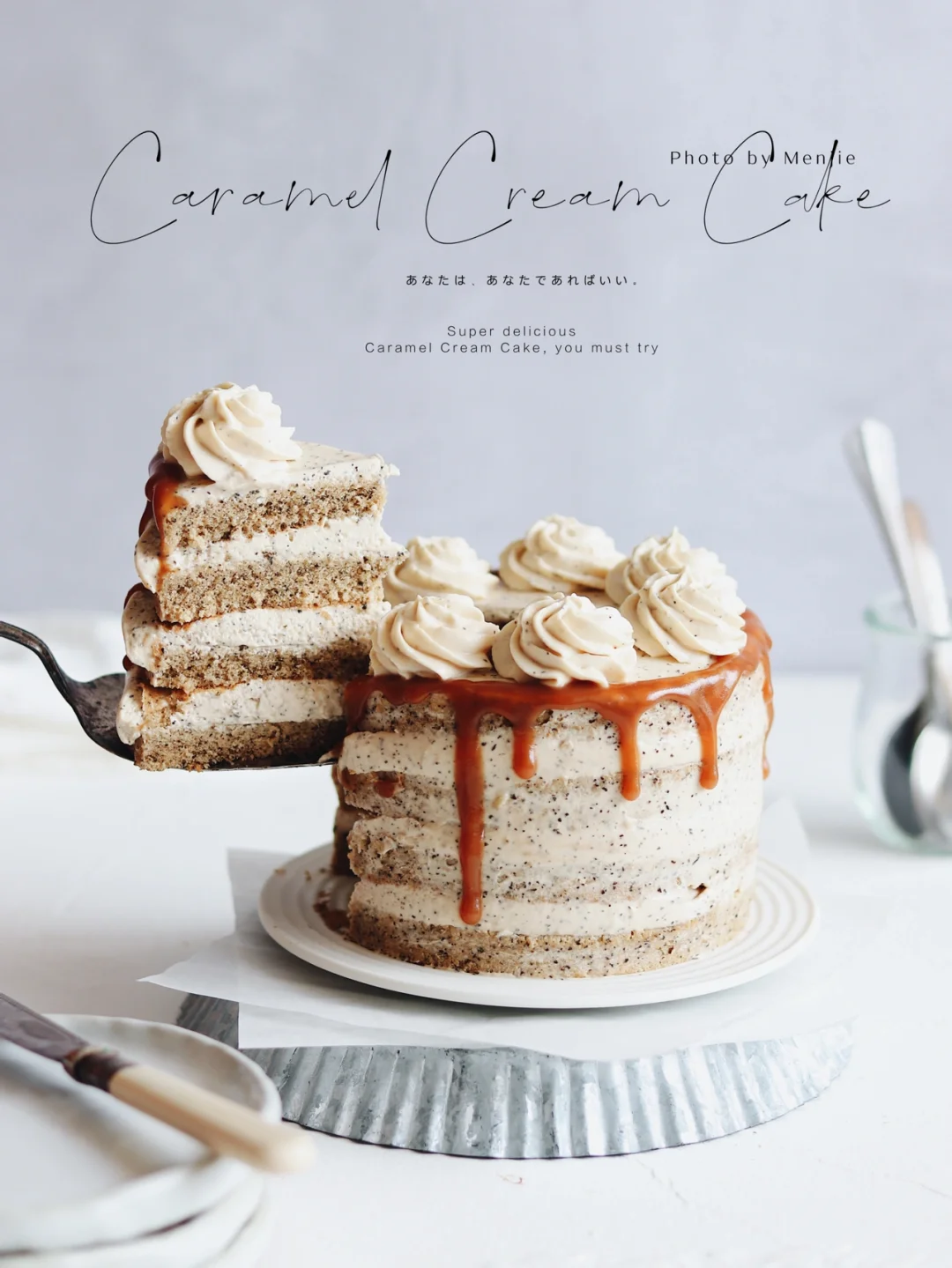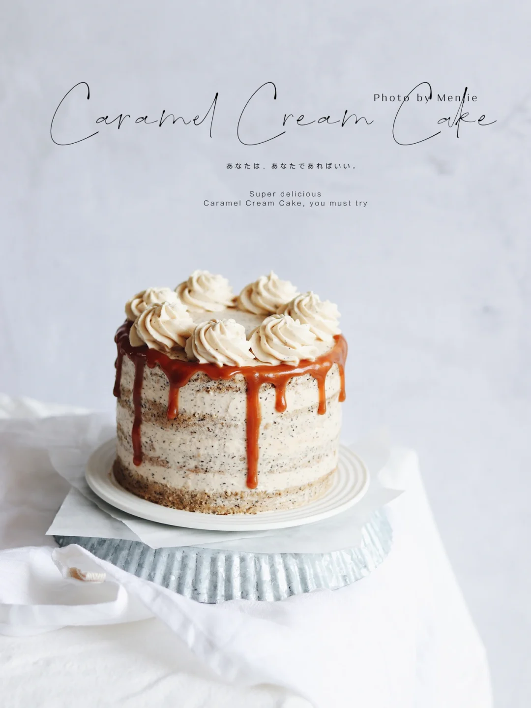 ❼将淡奶油、焦糖酱与之前留出的红茶粉混合打发至抹面状态。晾凉的蛋糕胚用5寸慕斯圈压出4片。然后按一片蛋糕一层奶油这样组装起来,顶部也抹上奶油,再挤上花装饰一下即可。