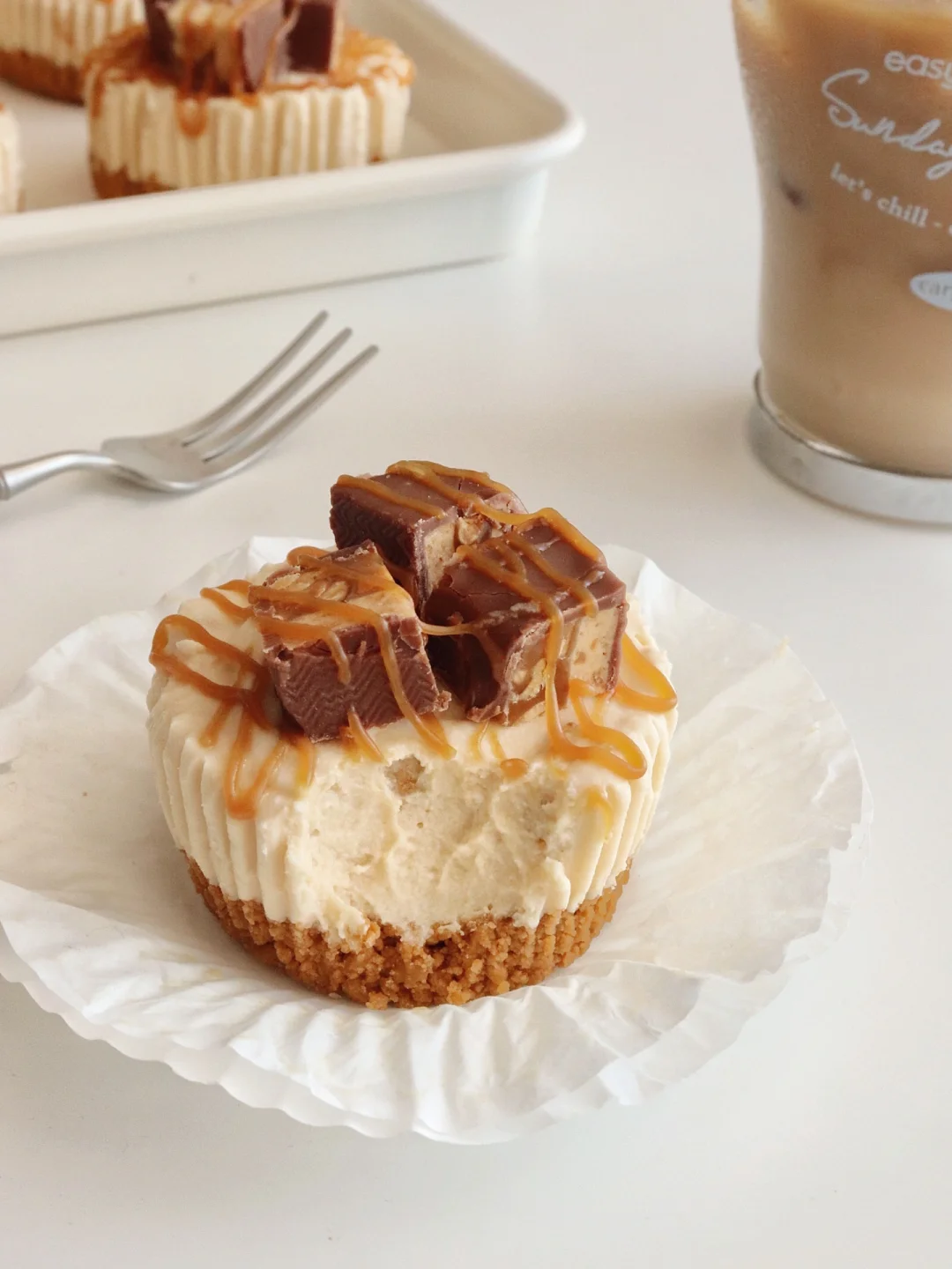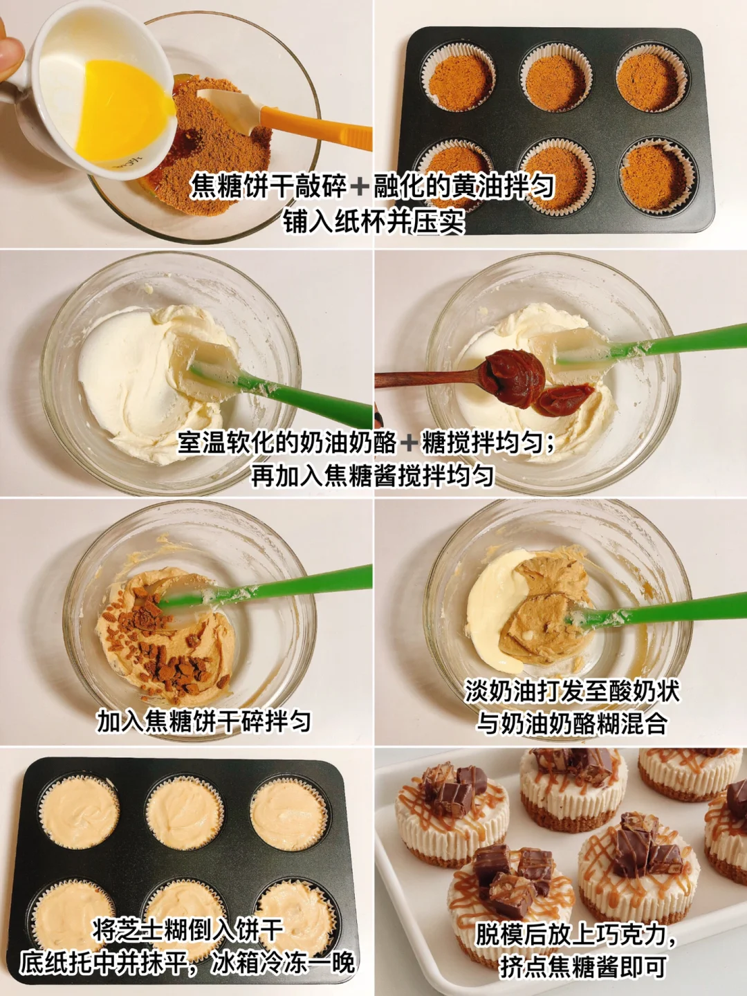 1️⃣焦糖饼干敲碎➕融化的黄油拌匀,铺入纸杯并压实,冰箱冷藏备用