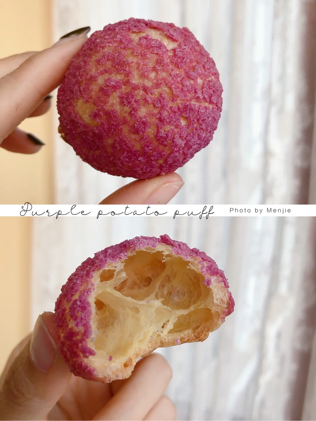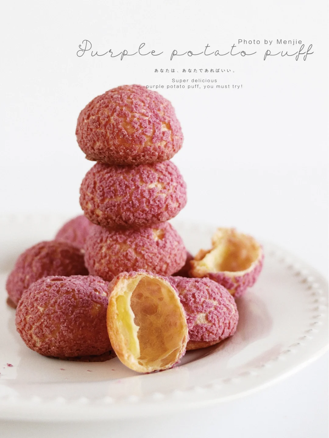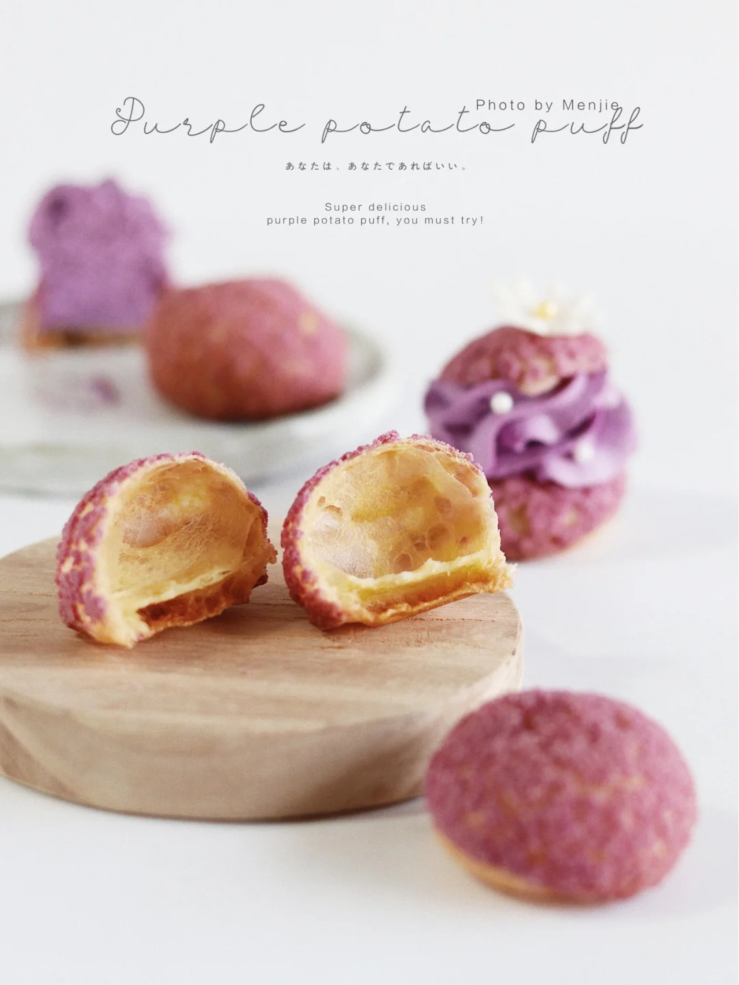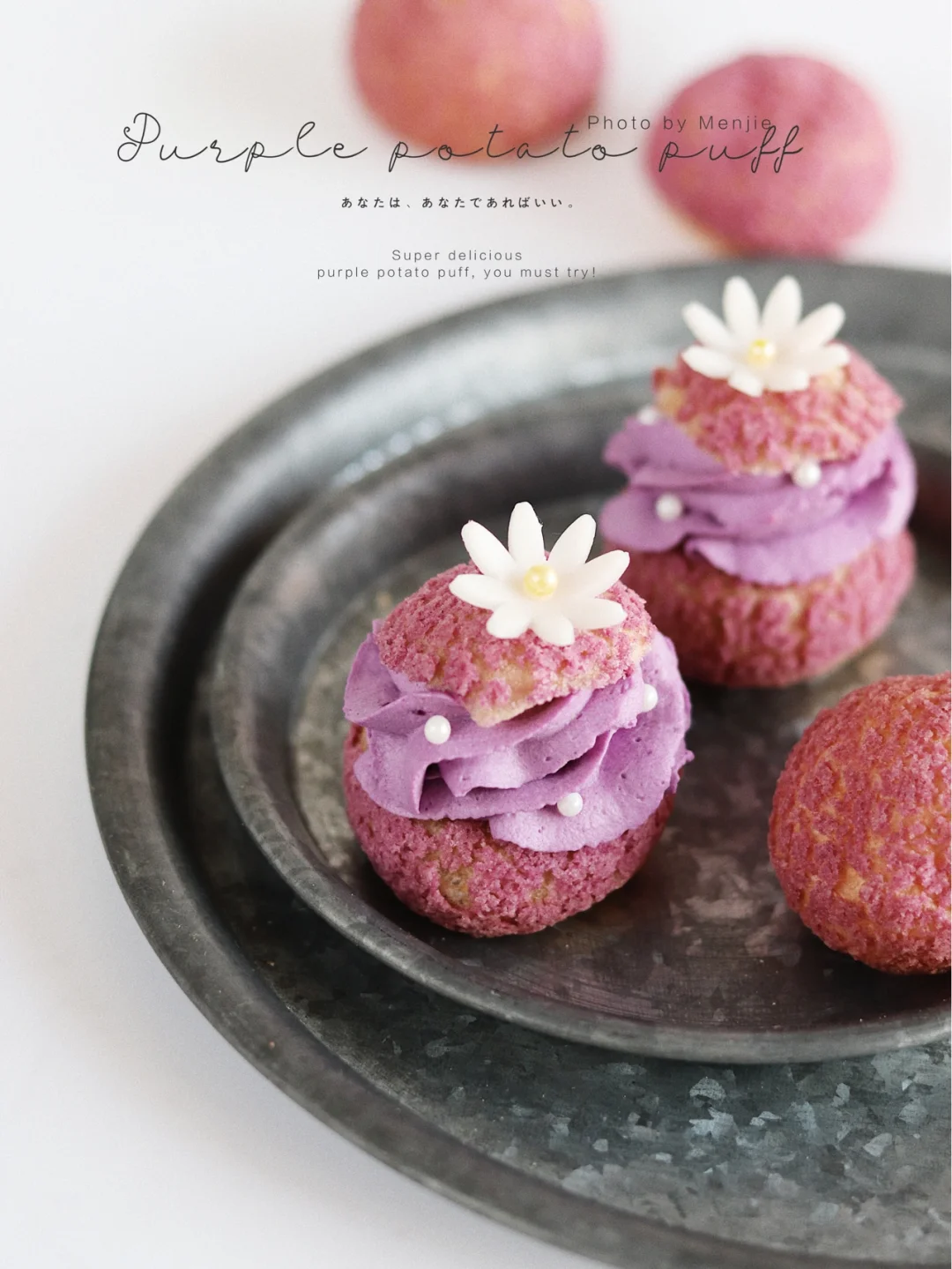 ❾将泡芙顶部切开,淡奶油➕细砂糖➕紫薯粉打发挤入泡芙里,坠后做装饰即可