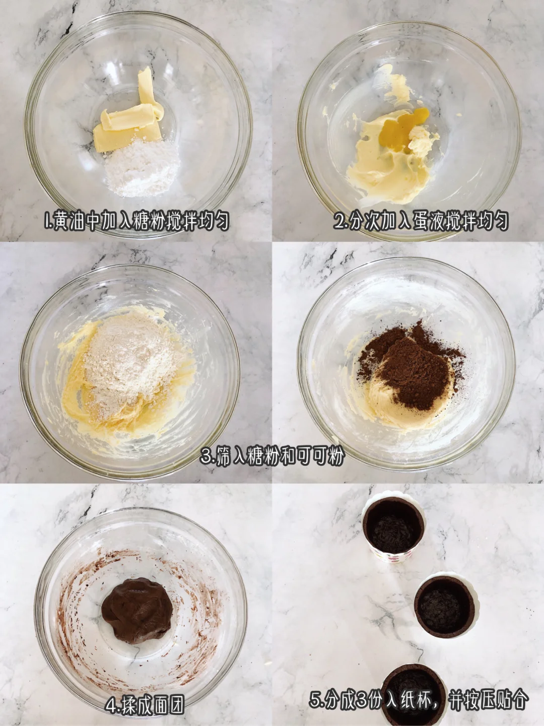 ❶黄油与糖粉搅拌均匀,分次加入蛋液搅拌均匀,筛入低粉和可可粉揉成面团。