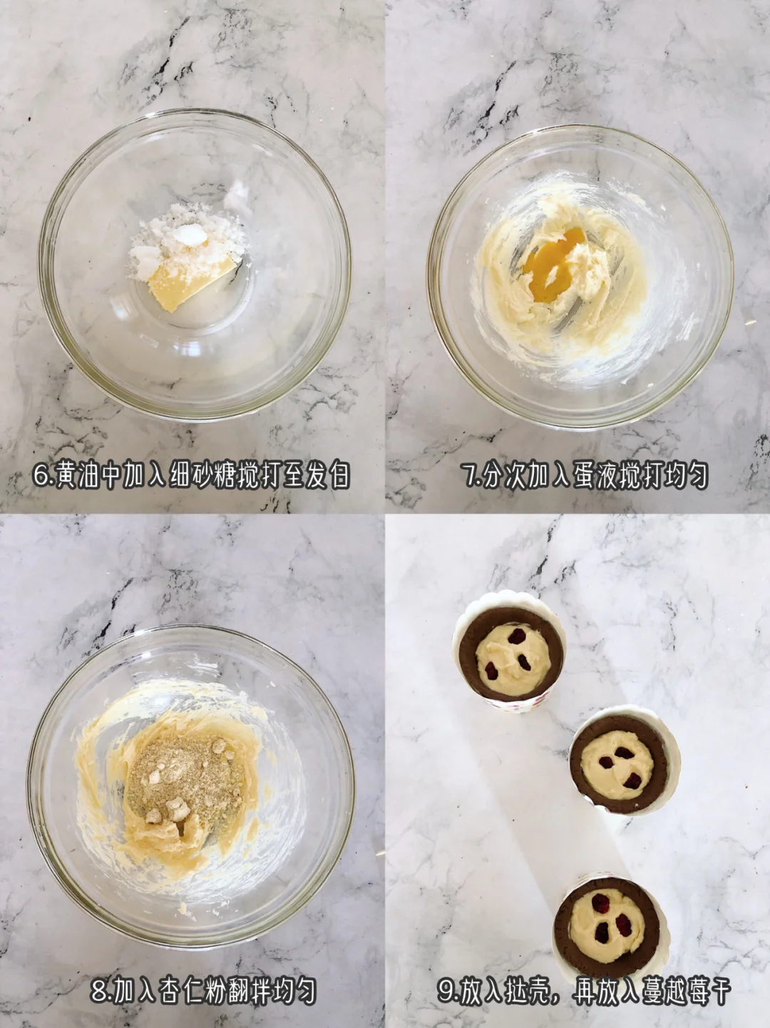 ❸做内馅:黄油中加入细砂糖搅打至发白,分次加入蛋液搅打均匀,加入杏仁粉翻拌均匀。