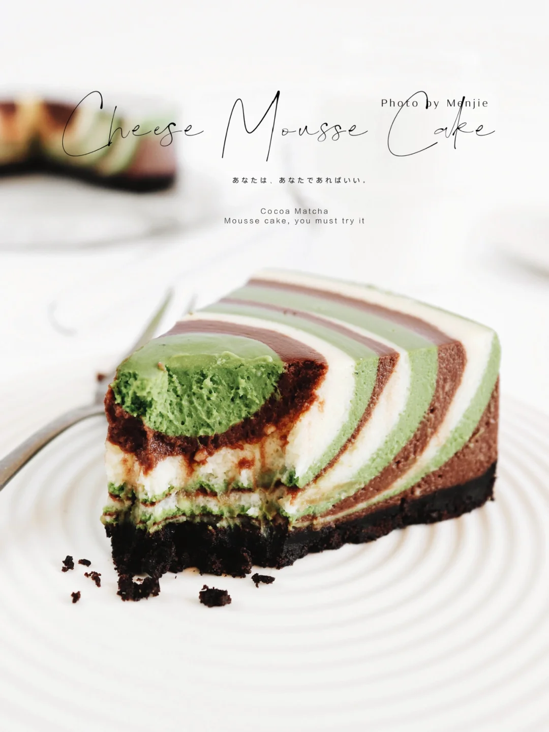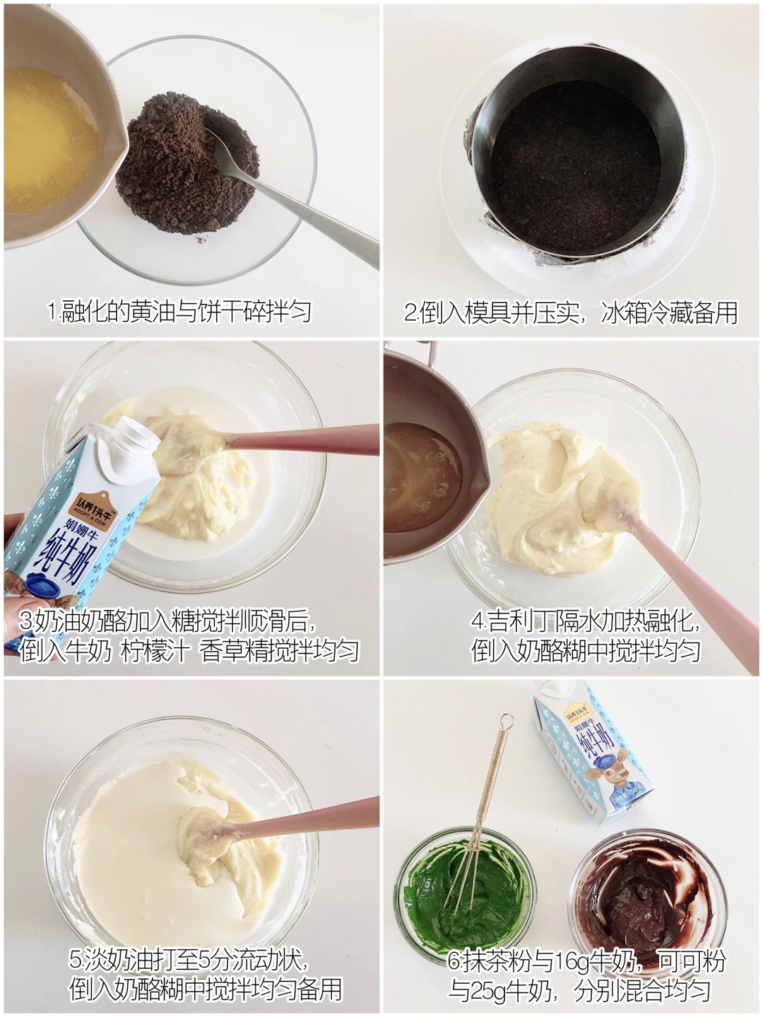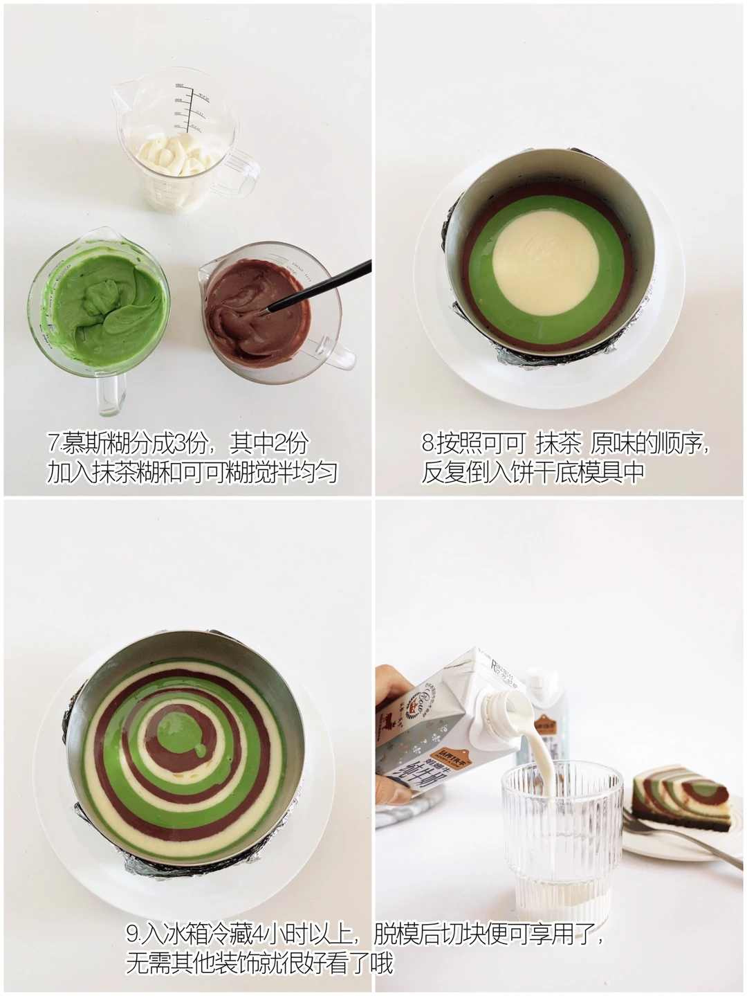 ❻从冰箱取出冷藏的饼干底模具,按照可可、抹茶、原味的顺序(慕斯糊是流动状的比较好操作,如果太稠,可以隔水加热一下),反复倒入模具中,入冰箱冷藏4小时以上。