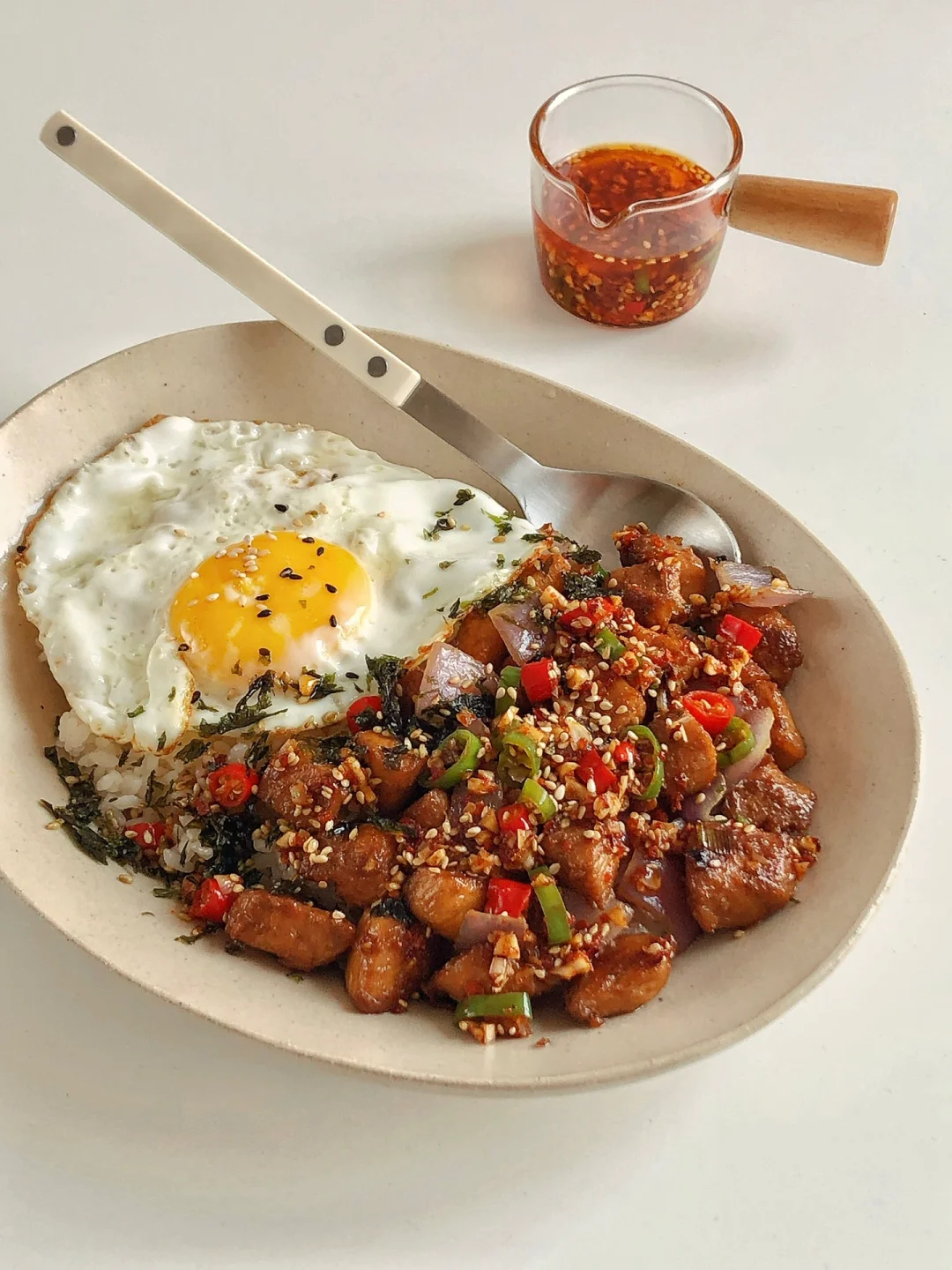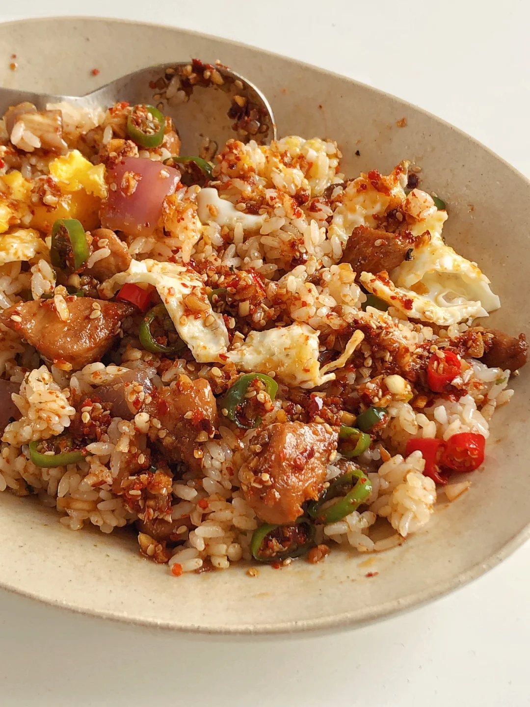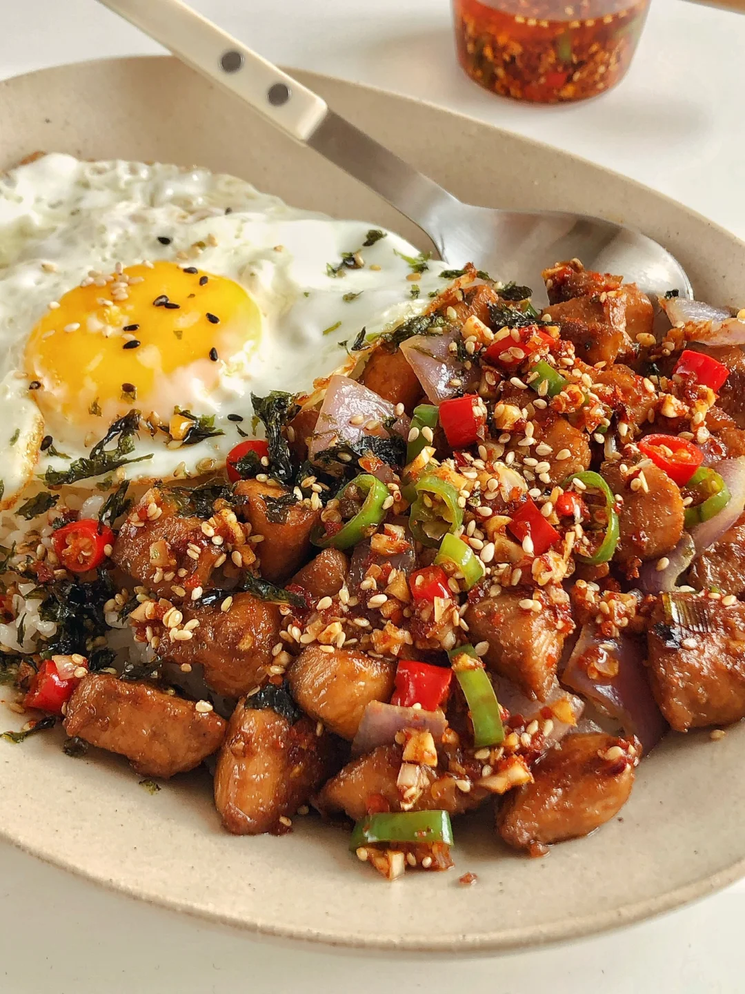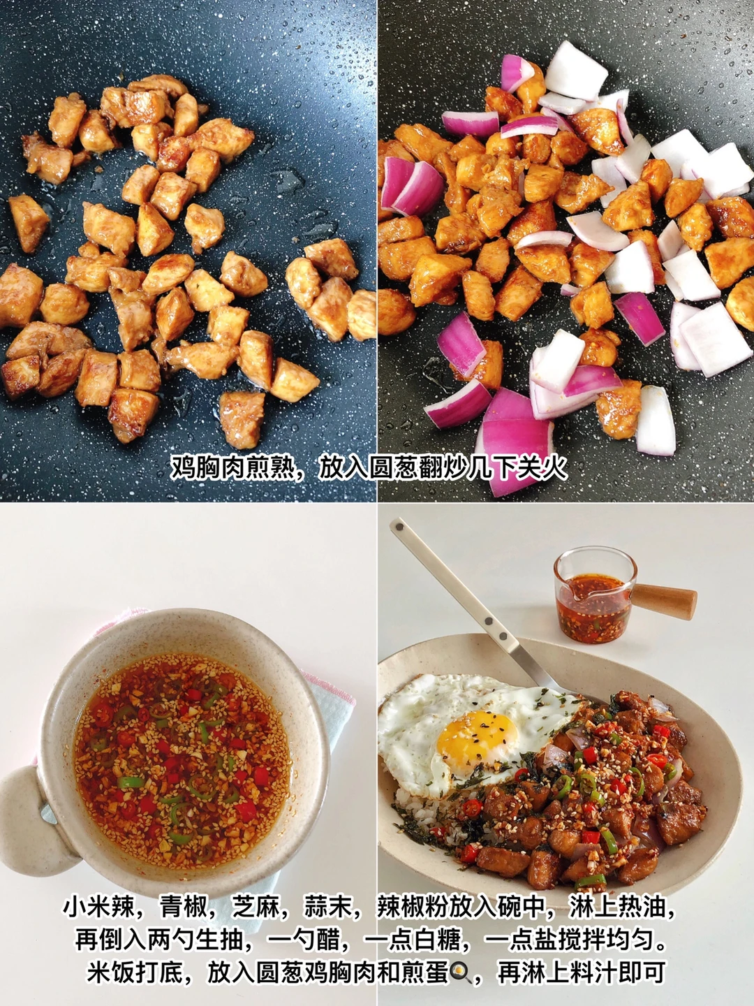 天气炎热,不知道吃什么的时候,就安排这款拌饭吧,香辣下饭!一次炫完一大盘超级爽 ✌︎(ᐛ)✌︎ 🍛 食材 鸡胸肉、圆葱🧅、小米辣、青椒🫑、蒜末、辣椒粉、芝麻、米饭🍚 🍛 做法 🔸鸡胸肉切小块,加1勺料酒,1勺生抽,一点老抽,、1勺淀粉抓匀腌制30分钟 🔸再调个料汁:蒜末、小米辣、青椒、芝麻放碗里,淋上热油,再加2勺生抽,1勺醋,适量白糖和盐拌匀。 🔸鸡胸肉煎熟,再放入圆葱翻炒几下 🔸米饭打底,放上圆葱鸡胸肉、煎蛋🍳、淋上料汁就可以开吃了