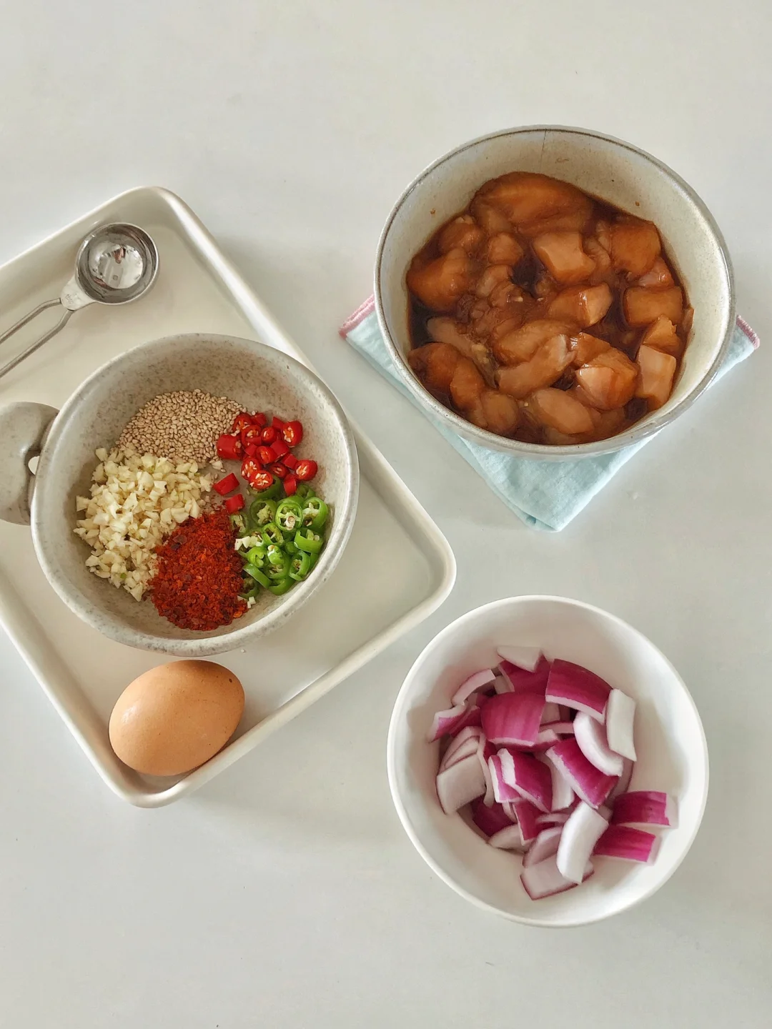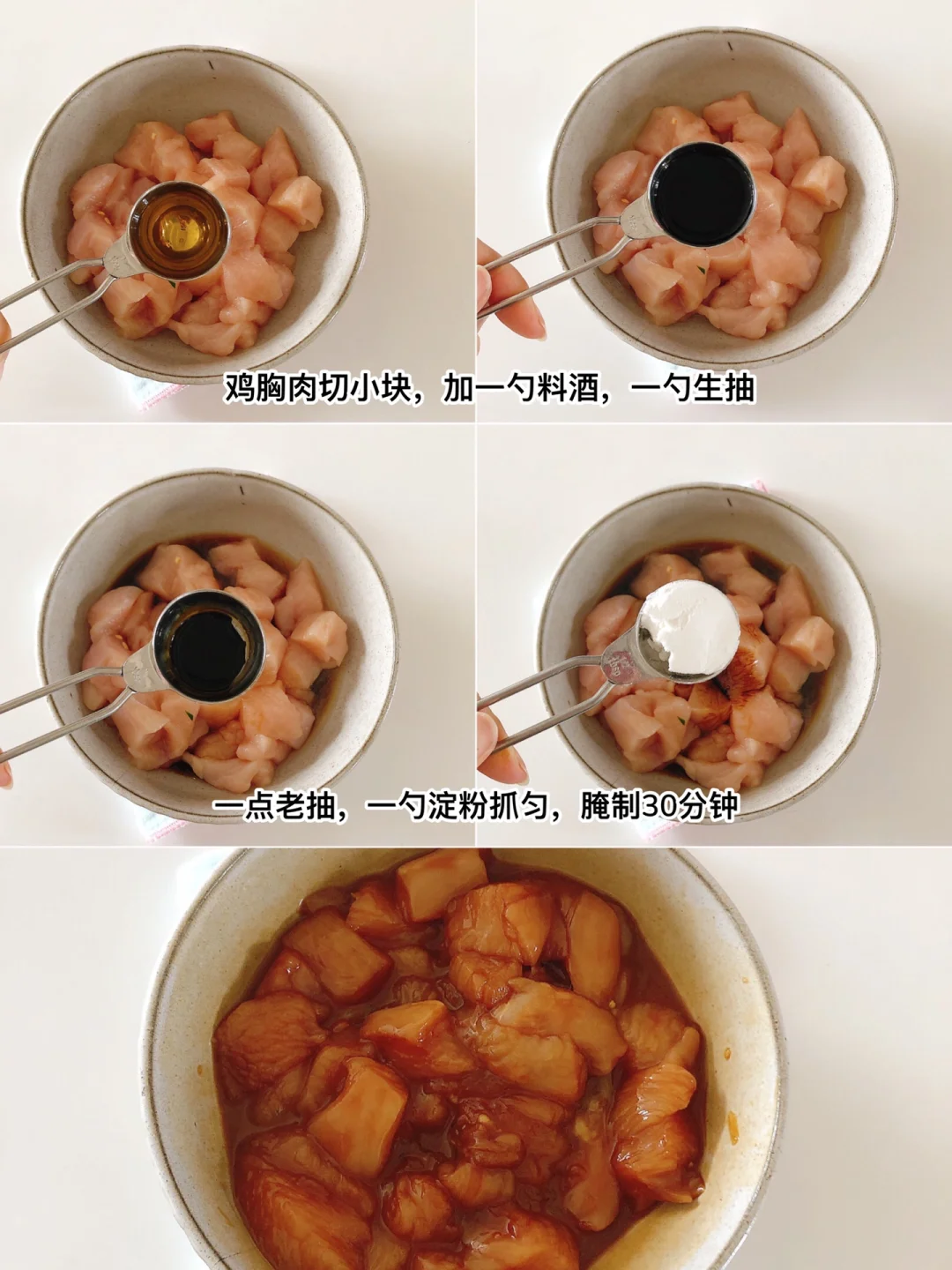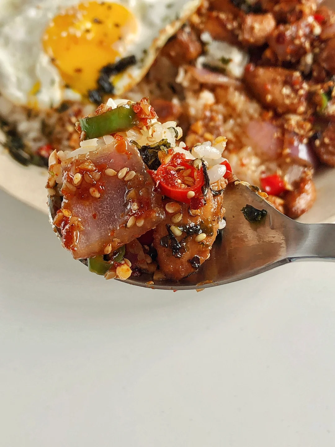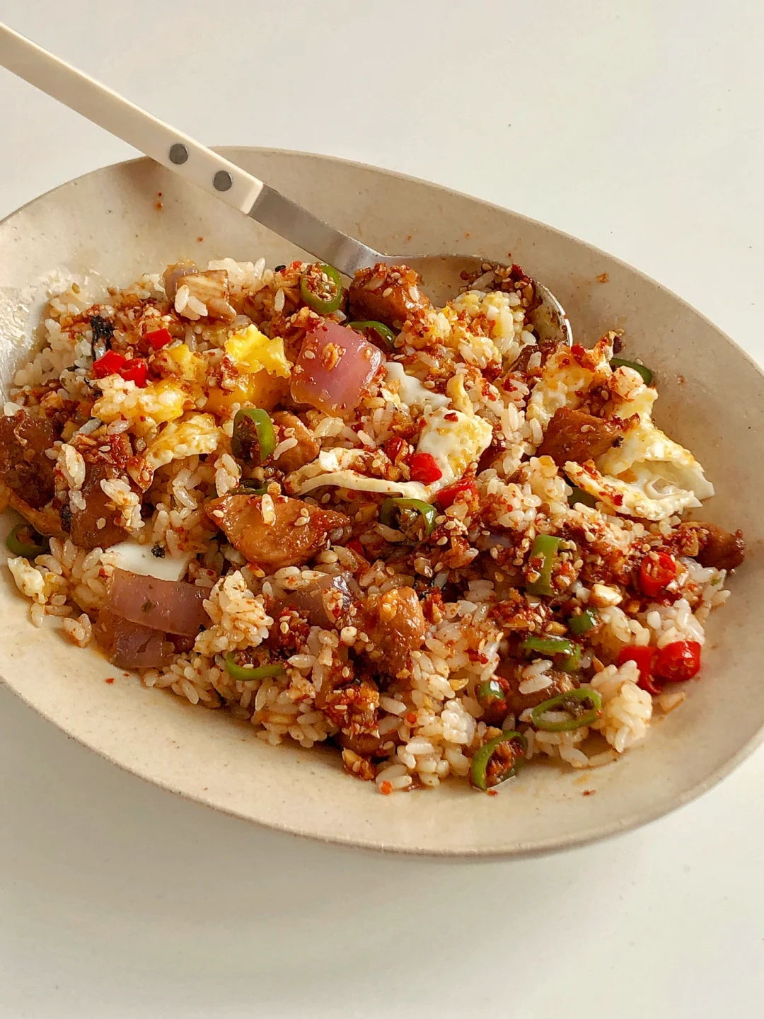 天气炎热,不知道吃什么的时候,就安排这款拌饭吧,香辣下饭!一次炫完一大盘超级爽 ✌︎(ᐛ)✌︎ 🍛 食材 鸡胸肉、圆葱🧅、小米辣、青椒🫑、蒜末、辣椒粉、芝麻、米饭🍚 🍛 做法 🔸鸡胸肉切小块,加1勺料酒,1勺生抽,一点老抽,、1勺淀粉抓匀腌制30分钟 🔸再调个料汁:蒜末、小米辣、青椒、芝麻放碗里,淋上热油,再加2勺生抽,1勺醋,适量白糖和盐拌匀。 🔸鸡胸肉煎熟,再放入圆葱翻炒几下 🔸米饭打底,放上圆葱鸡胸肉、煎蛋🍳、淋上料汁就可以开吃了