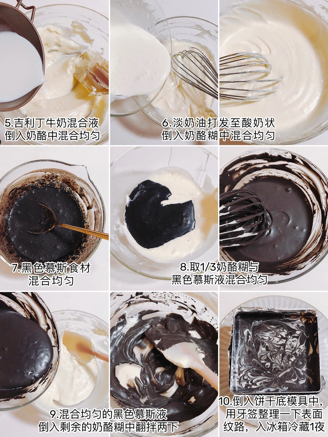 ❻混合好的黑色慕斯糊,倒入剩余的白色慕斯糊中拌两下(只拌两下哦)