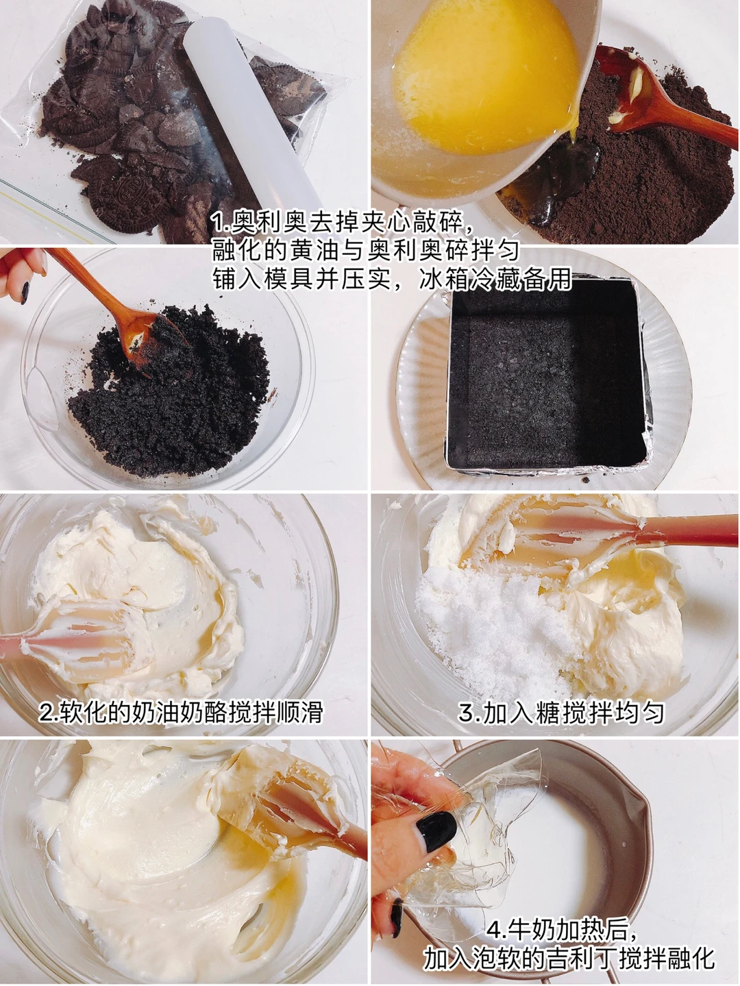 ❶饼干底:奥利奥去掉夹心敲碎,加入融化的黄油拌匀,铺入模具并压实,入冰箱冷藏备用