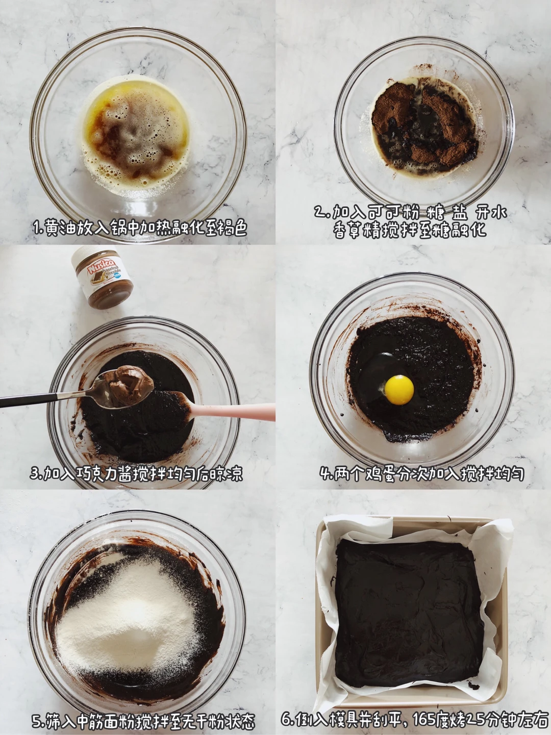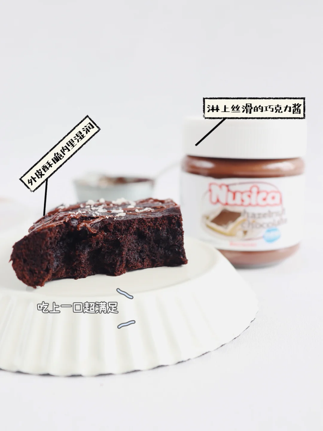 ❺倒入模具中,并刮平面糊。送入预热好的烤箱160度,烤25分钟左右。出炉晾凉切块,淋上 Nusica 巧克力酱,撒点椰蓉装饰即可。