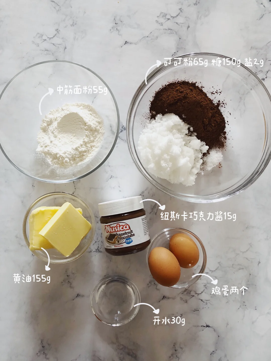 ❷将黄油倒入碗中,加入可可粉、糖、盐、开水、香草精搅拌至糖融化,放入巧克力酱搅拌均匀后晾凉。