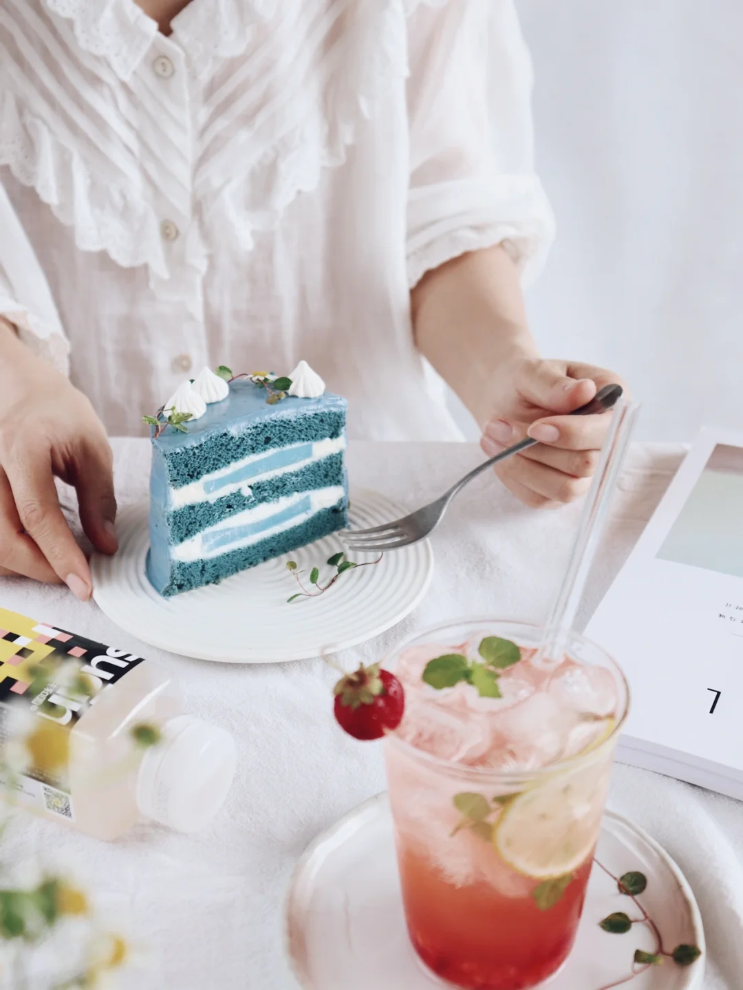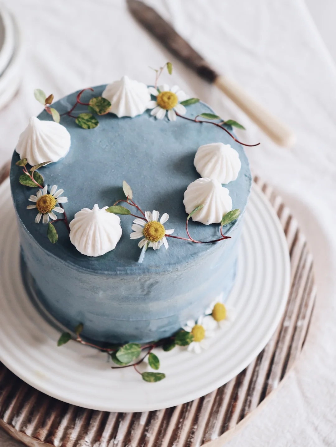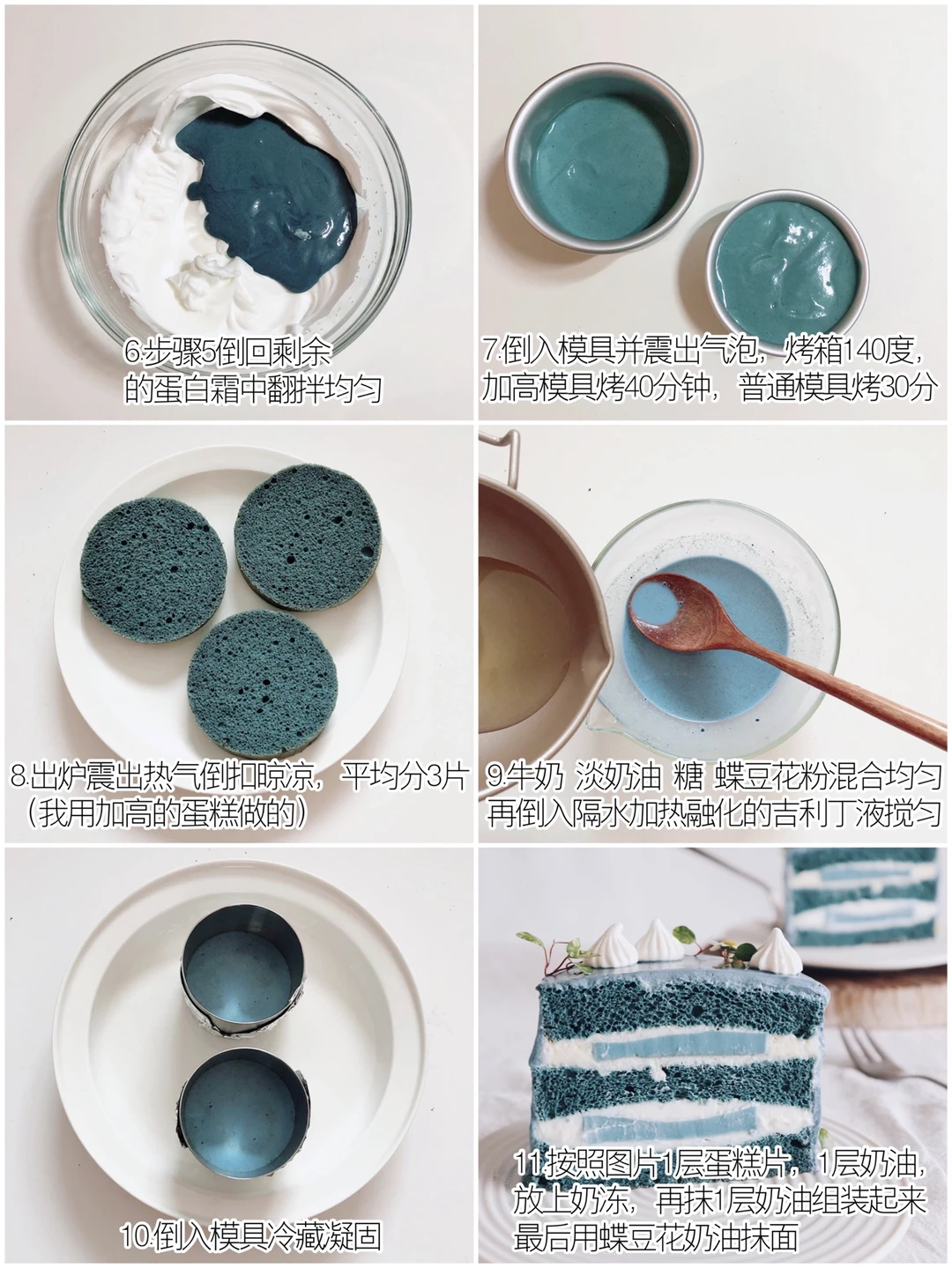 ❽蛋糕分成三片,一片蛋糕抹一层夹心奶油,放上奶冻,再抹一层奶油这样组装完成后,用蝶豆花奶油抹面,用蛋白糖、洋甘菊、绿植做装饰。