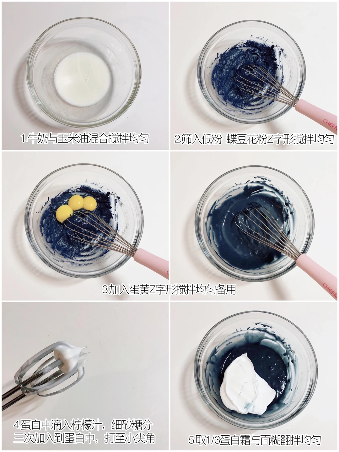❼淡奶油100g+细砂糖5g打发 (夹心用),淡奶油100g+细砂糖5g+适量蝶豆花粉打发 (抹面用)