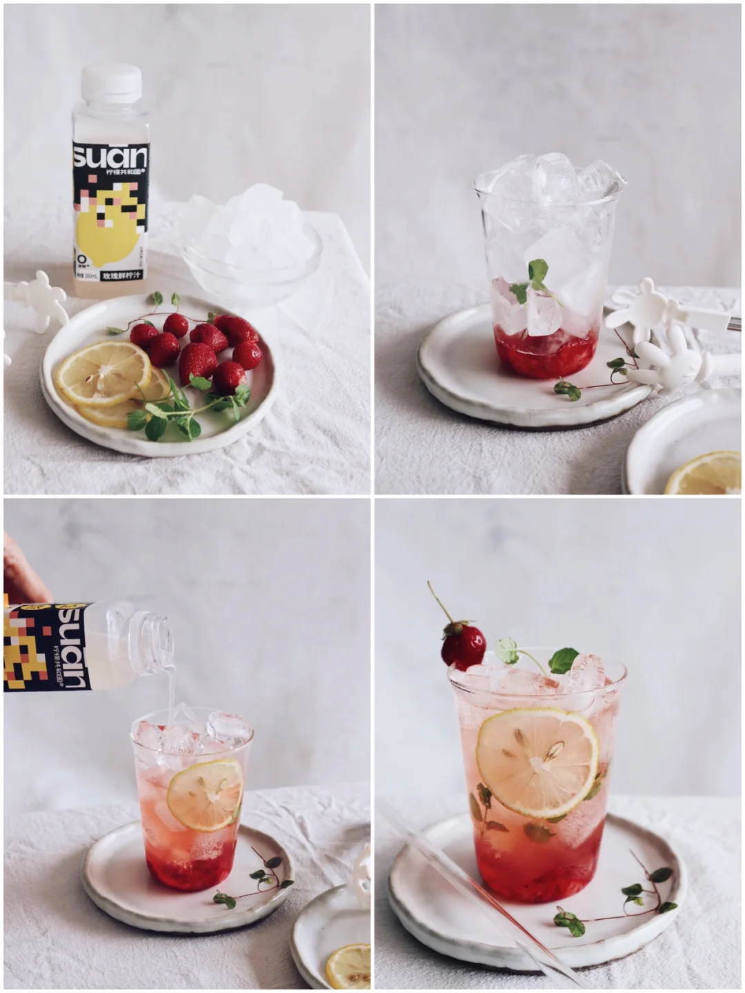 食材:玫瑰鲜柠汁 冰块🧊 草莓 柠檬片 薄荷