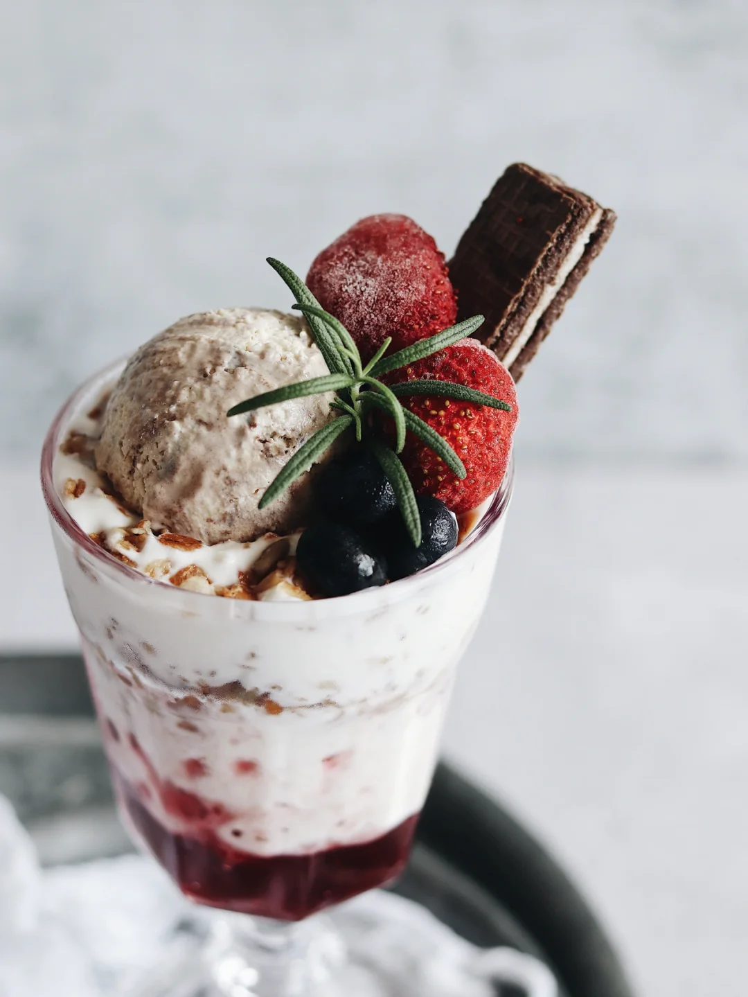 ❸插上威化,挖一勺冰淇淋放上去,摆上草莓和蓝莓,然后用迷迭香装饰一下就好了。