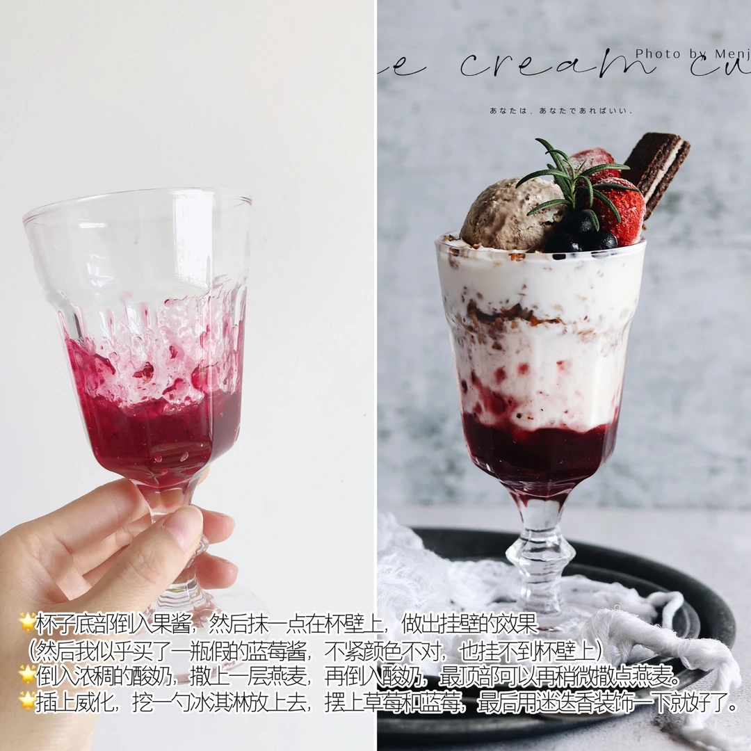 ❶杯子底部倒入果酱,然后抹一点在杯壁上,做出挂壁的效果(然而我似乎买了一瓶假的蓝莓酱,不紧颜色不对,也挂不到杯壁上[失望R])