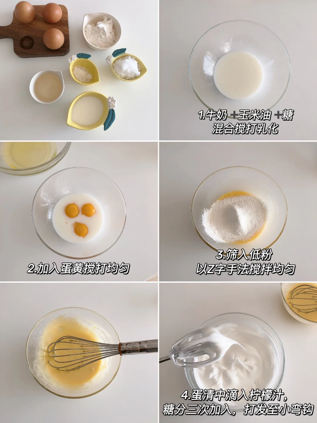 鸡蛋3个|牛奶45g|玉米油30g|糖5g|低粉40g|糖50g|柠檬汁 适量