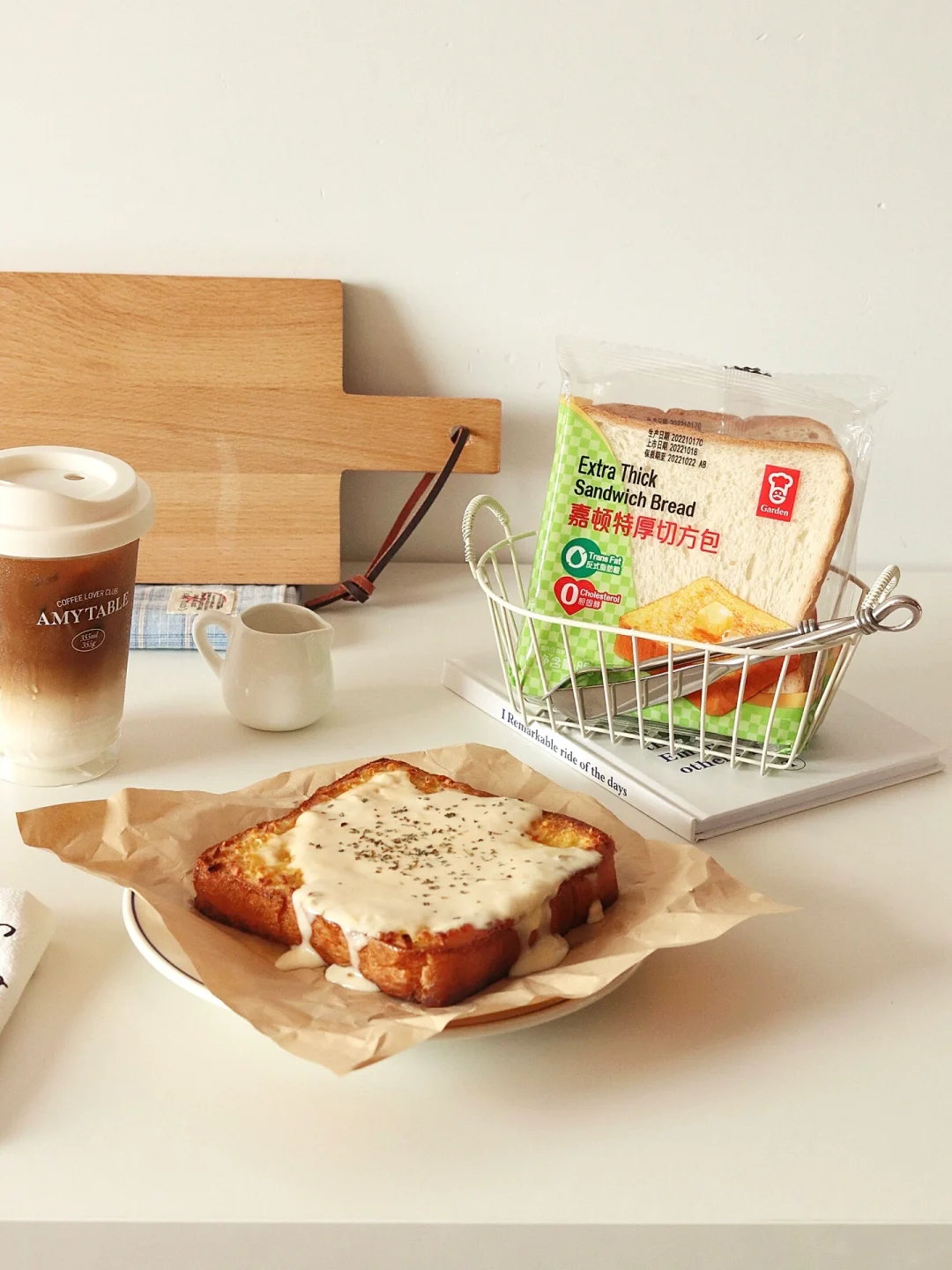 我用的是嘉顿特厚切方包,2.6cm超厚哒,而且松软有弹性,敲适合做各种三明治早餐和高颜值下午茶~
