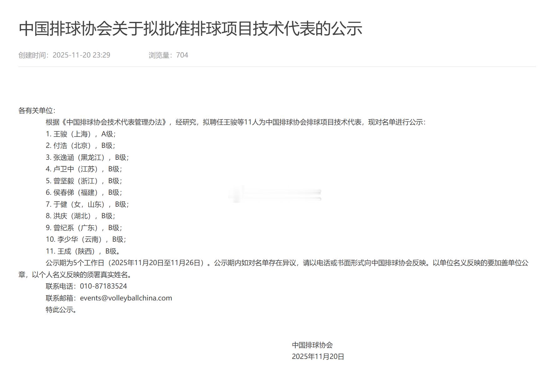 中国排球协会关于拟批准排球项目技术代表的公示1. 王骏(上海),A级;2. 付浩(北京),B级;3. 张逸涵(黑龙江),B级;4. 卢卫中(江苏),B级;5. 曾坚毅(浙江),B级;6. 侯春俤(福建),B级;7. 于健(女,山东),B级;8. 洪庆(湖北),B级;9. 曾纪系(广东),B级;10. 李少华(云南),B级;11. 王成(陕西),B级。