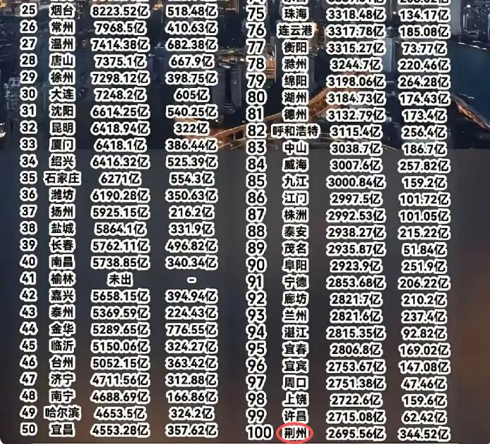 2025年前三季度,荆州经济总量为2695亿元,在全国城市中排第100名,成功跻