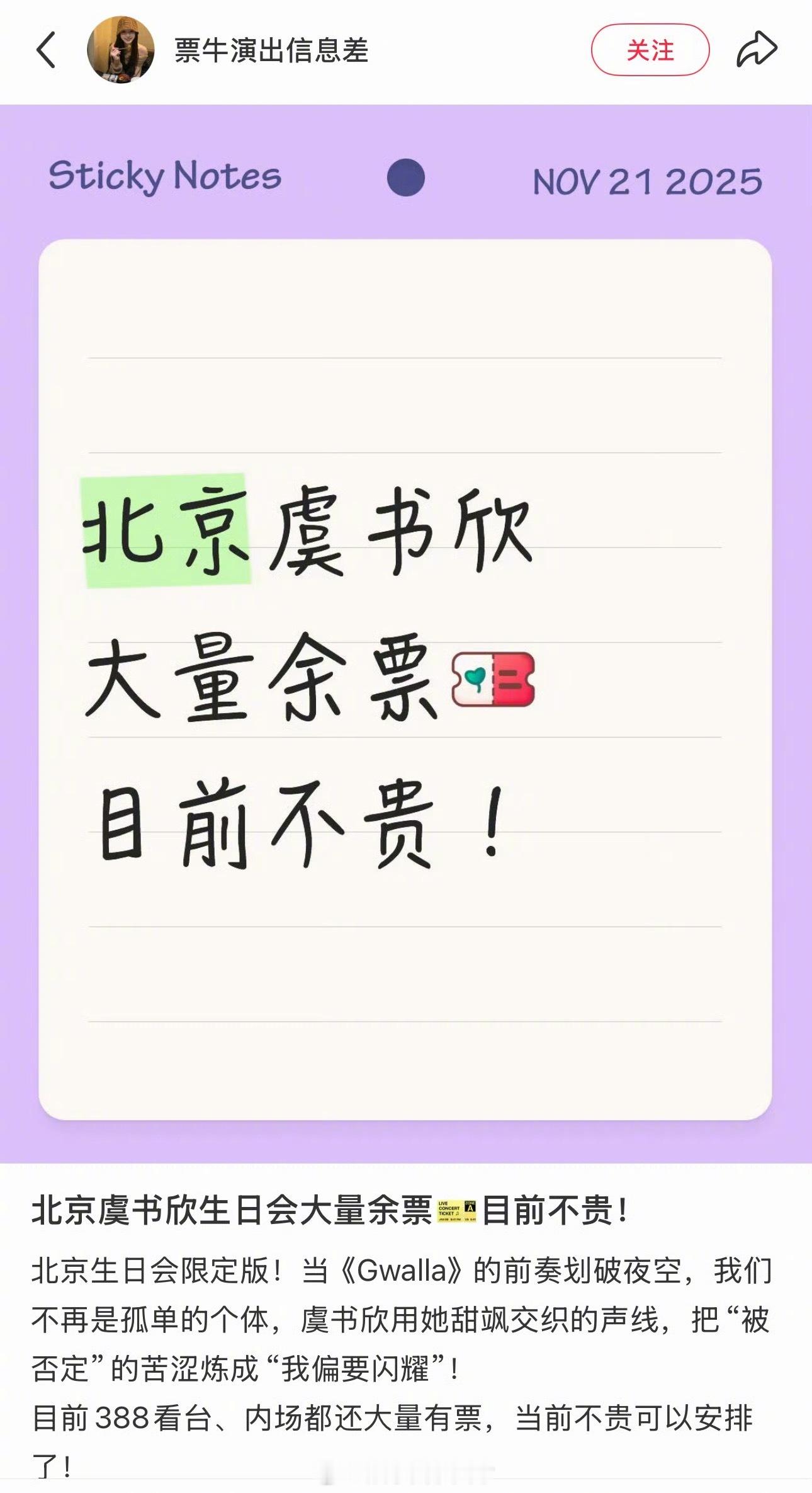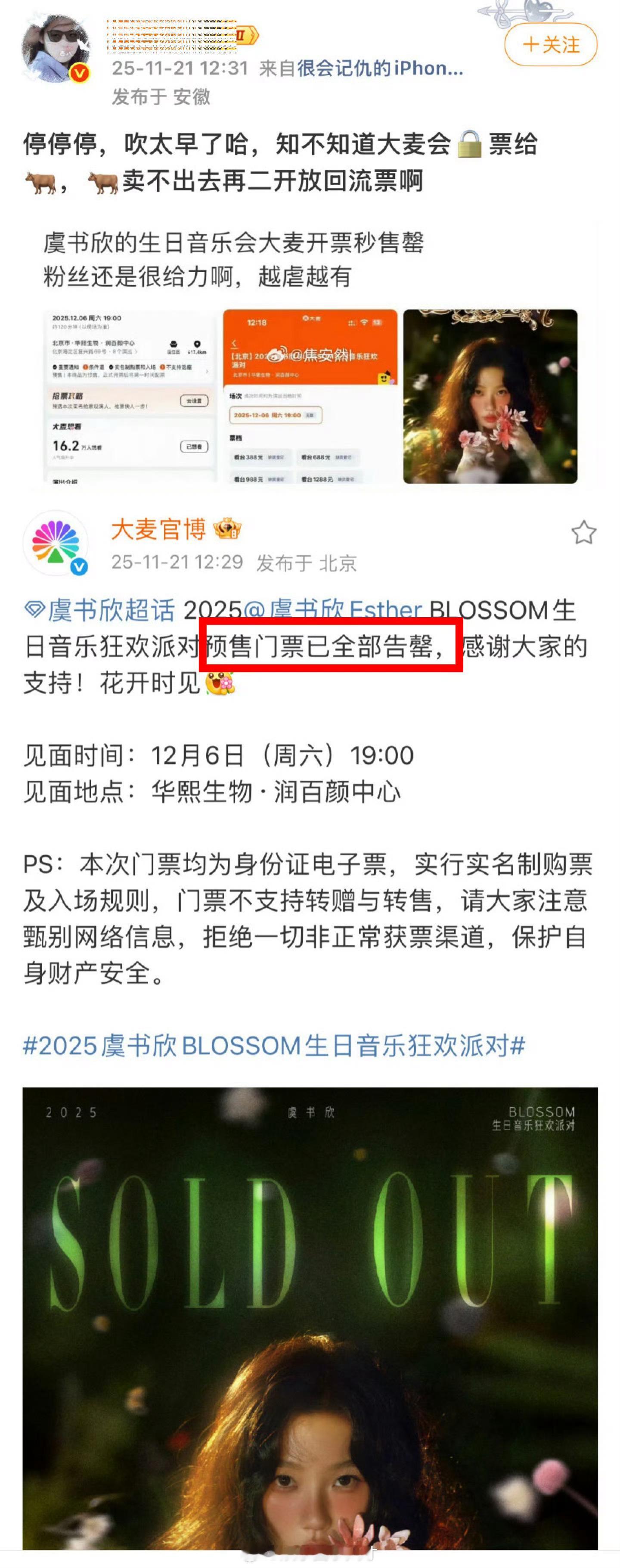 大麦发文表示虞书欣生日会门票售罄,但是有🐂在平台上发388和内场还有大量余票。票是都被🐂抢走了?