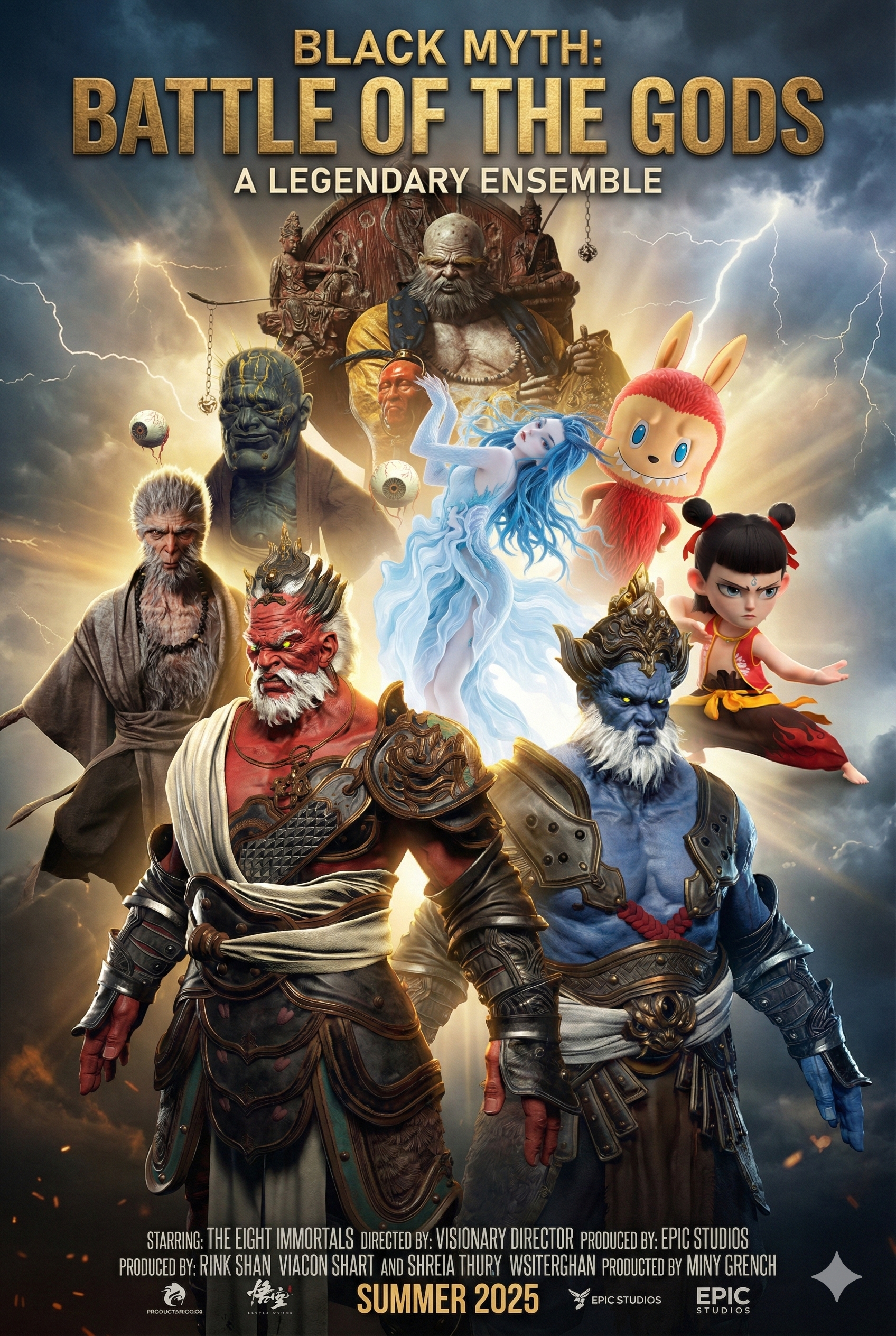 靠,什么奇怪的东西。提示词:创作一张专业的好莱坞大片电影海报设计,需包含提供图像中的所有 8 位 Boss。设计要求如下:主要构图:- 将所有 8 位角色从原图中扣出(如需要),以充满动感的英雄群像构图进行排列,需体现景深与层次关系- 核心英雄置于前景,其余角色错落分布在不同的景深位置,营造出层次分明的视觉效果- 采用极具张力的仰拍视角(虫眼视角)以突显力量感与宏大格局- 搭配史诗级天空或戏剧性背景(如暴风云层)- 运用电影级光影处理,强化高光与阴影对比,为角色轮廓镀上边缘光创意来源:x.com/AmirMushich/status/1991589122717413382